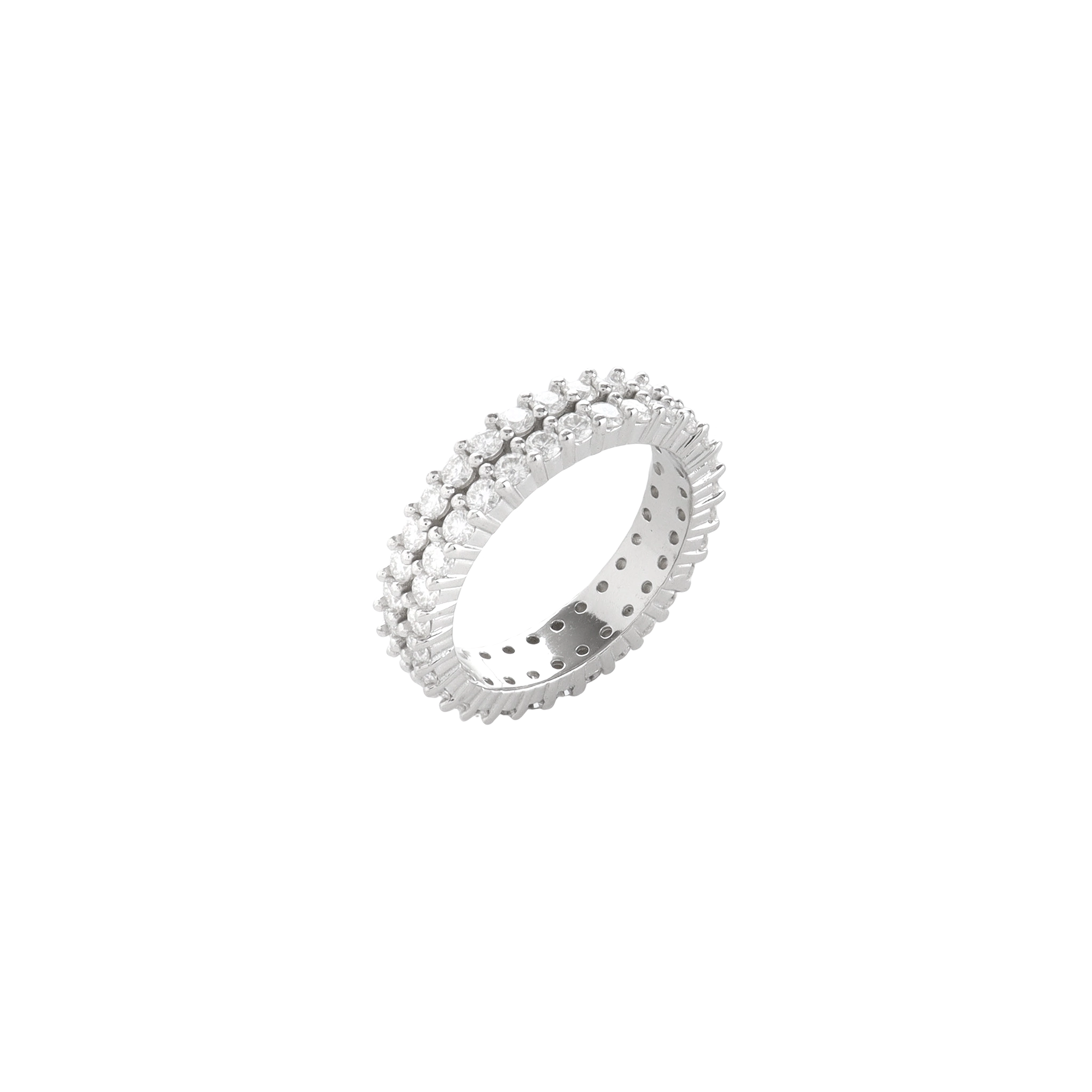 The Triple Eternity Diamond Ring, a silver ring with three rows of sparkling cubic zirconia stones.