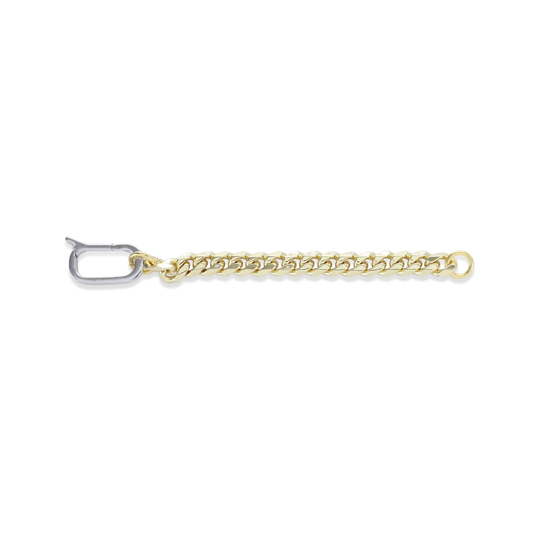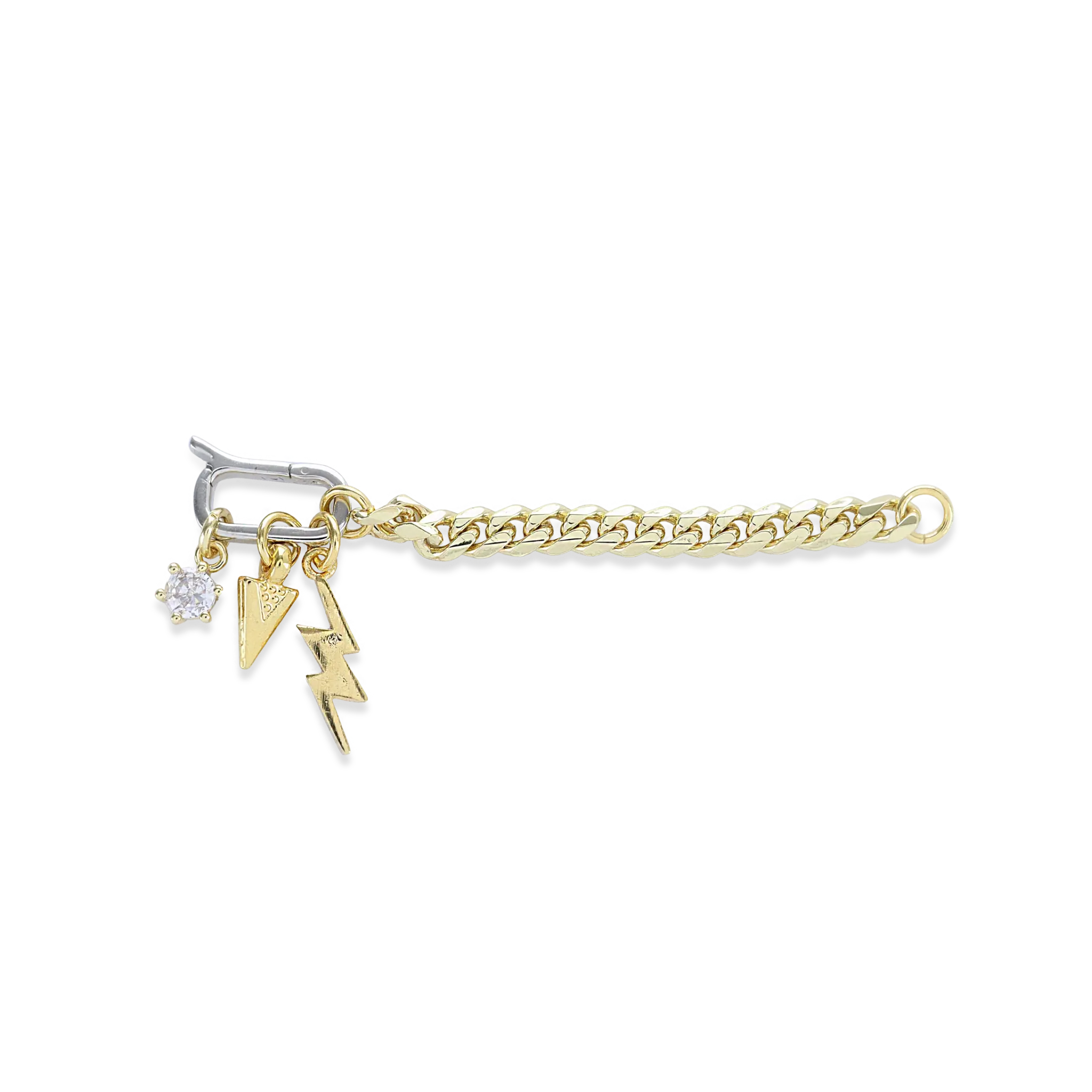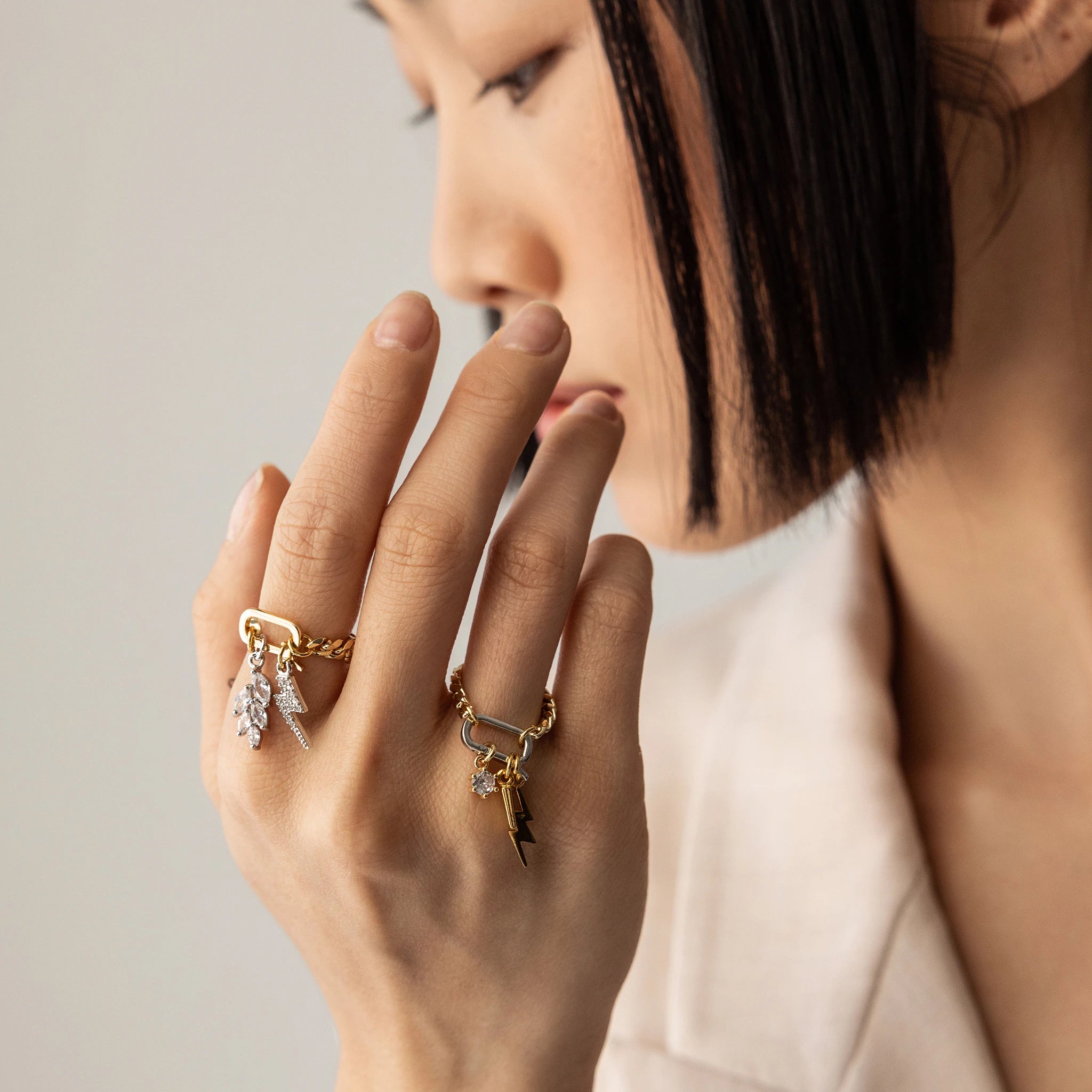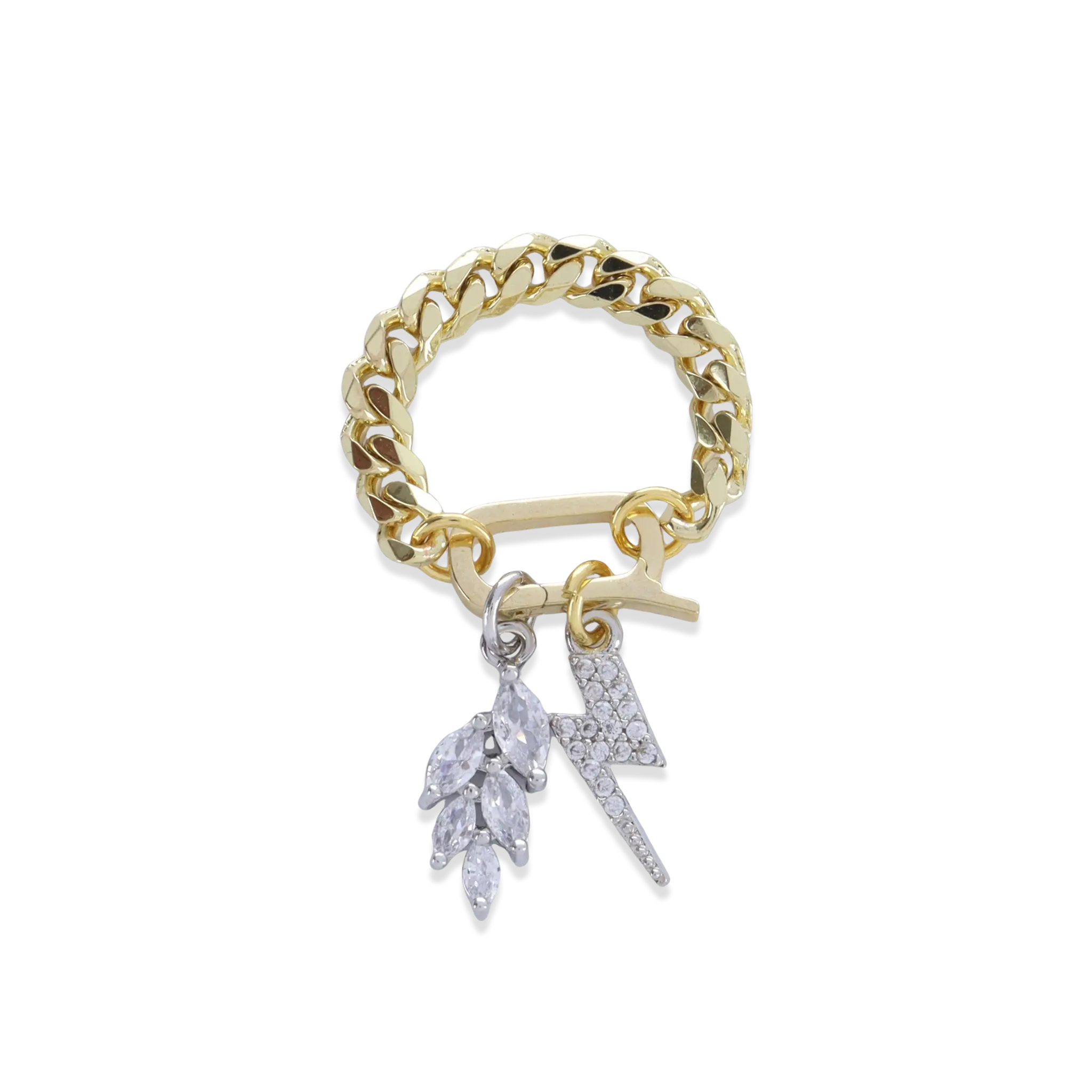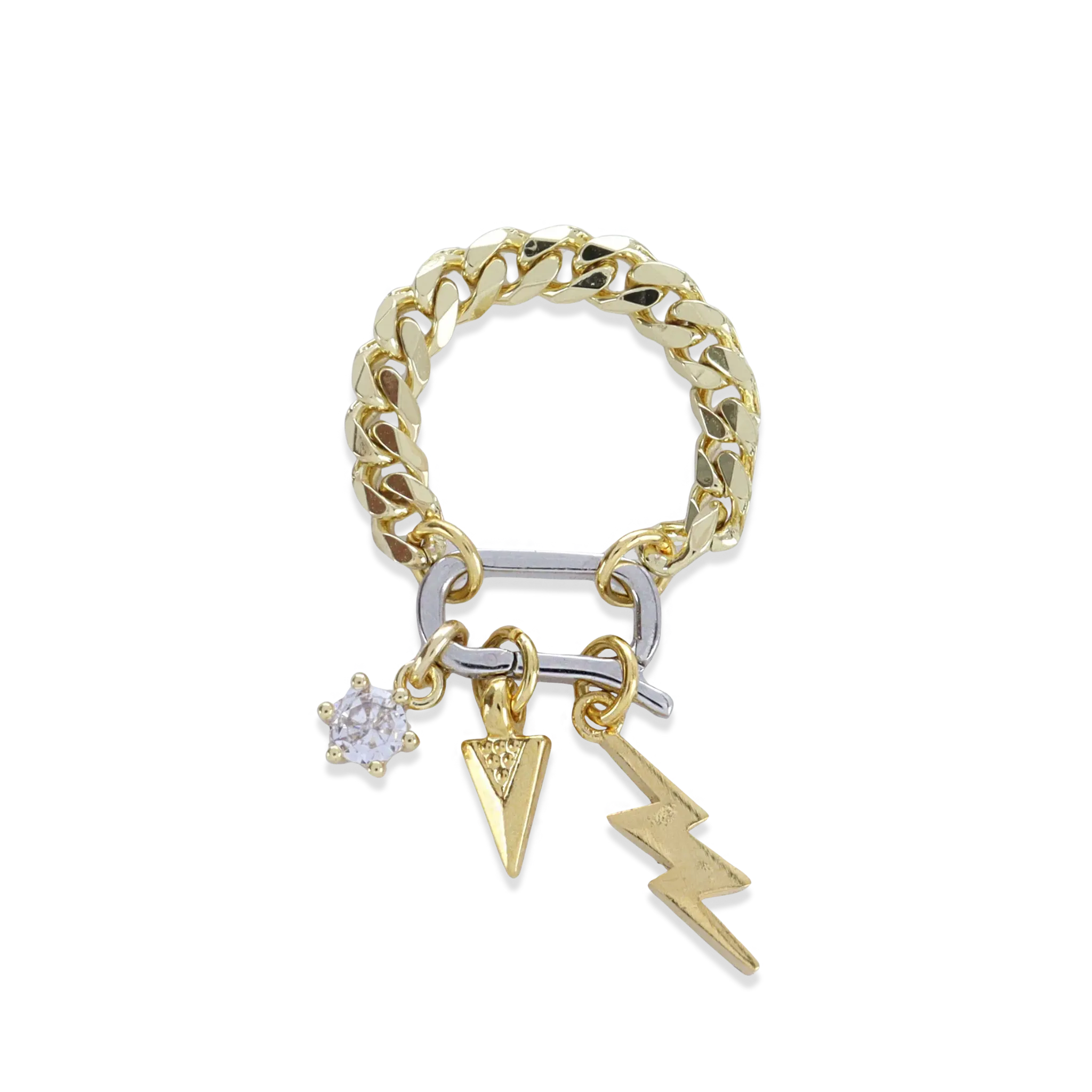 The Electric Leaf Can Opener Ring, a striking piece in gold with a silver clasp, featuring three unique charms—a clear crystal, a triangle with textured detail, and a lightning bolt. This edgy and modern design combines bold symbols with a sleek gold chain link, creating a statement accessory that adds personality to any look.