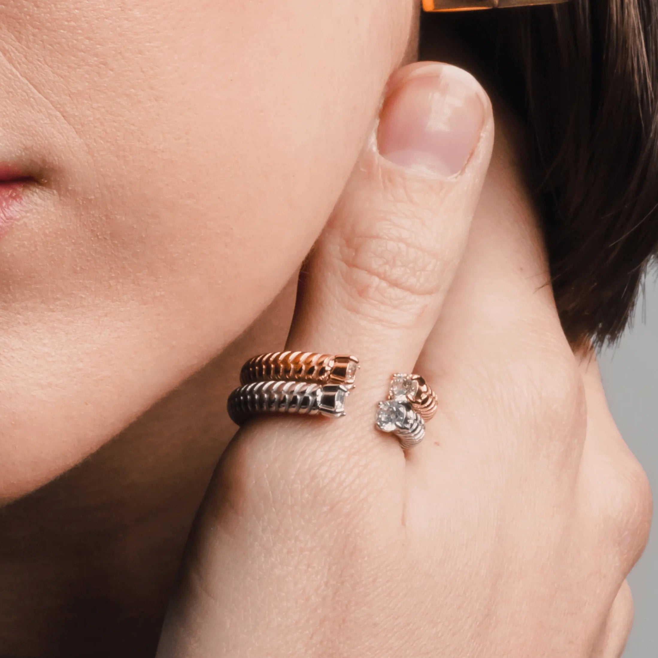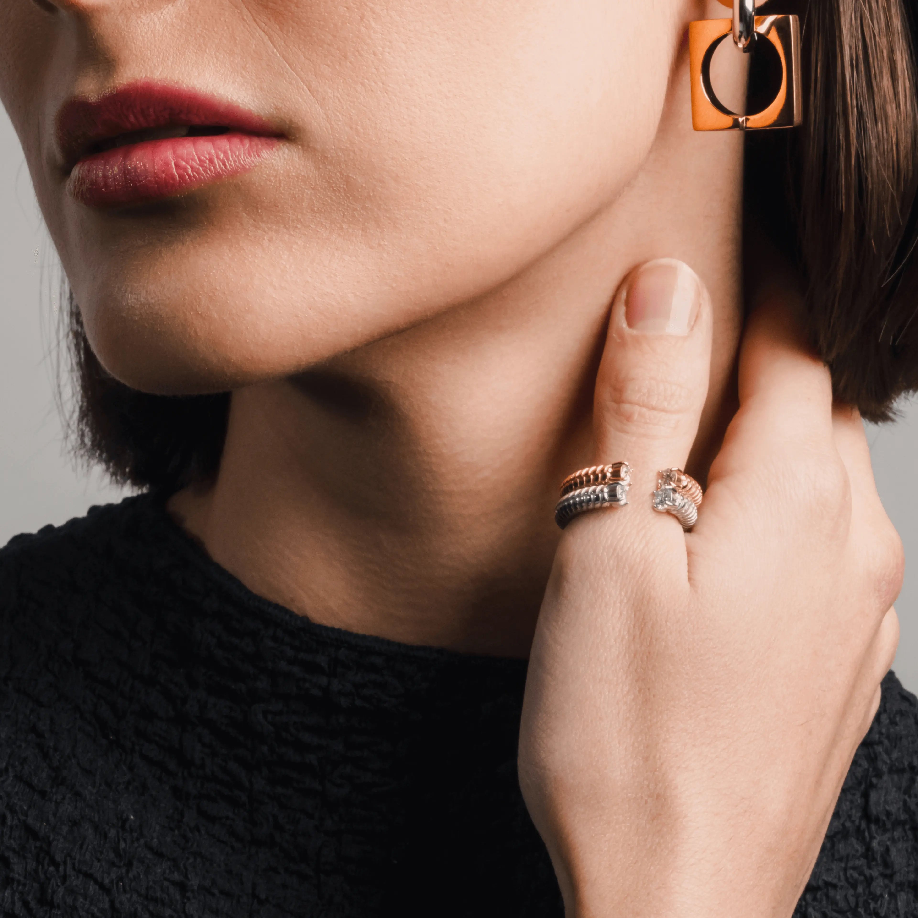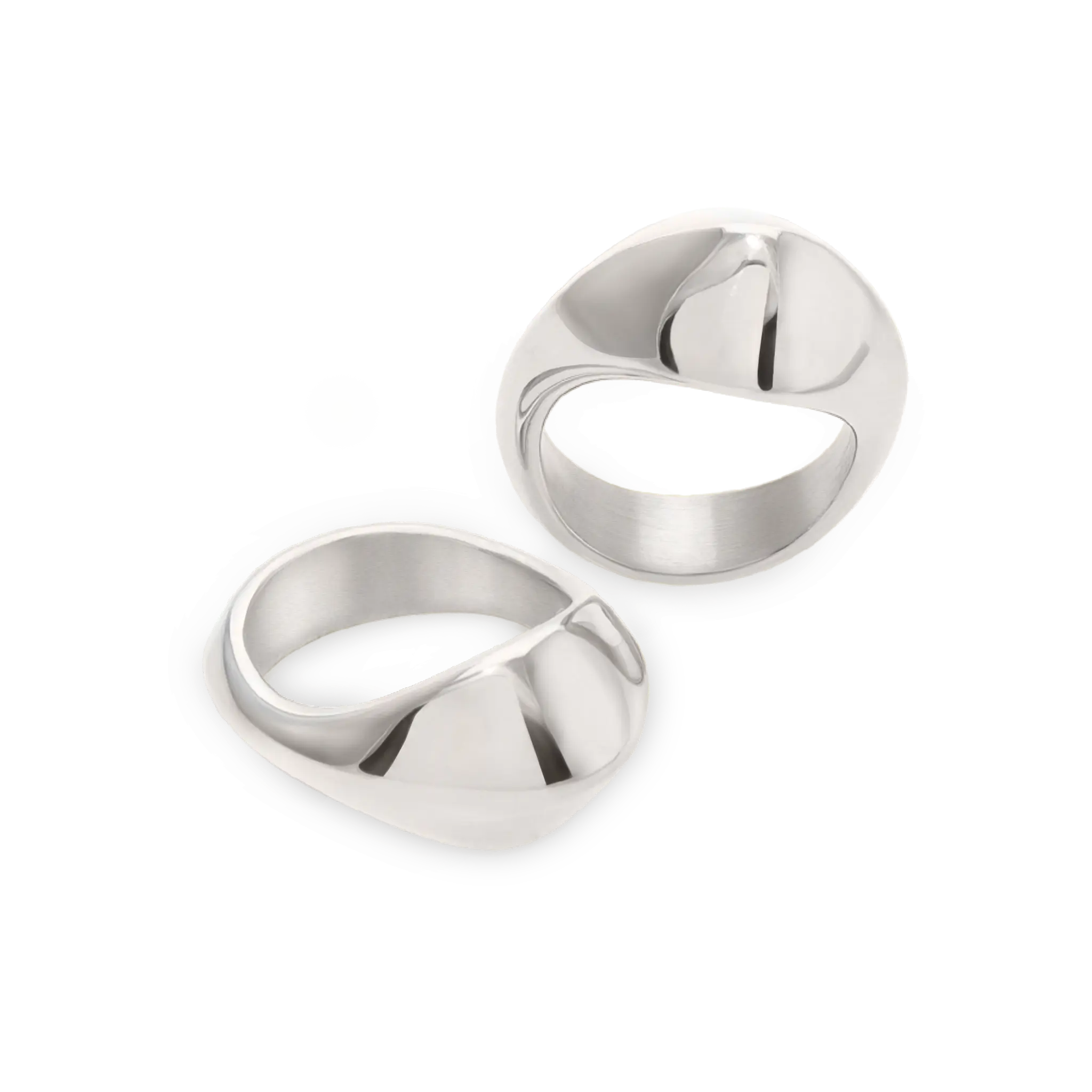 Model wearing the Fierce Ring in silver, featuring a bold and curvy design that exudes confidence and modern elegance. ||| SILVER