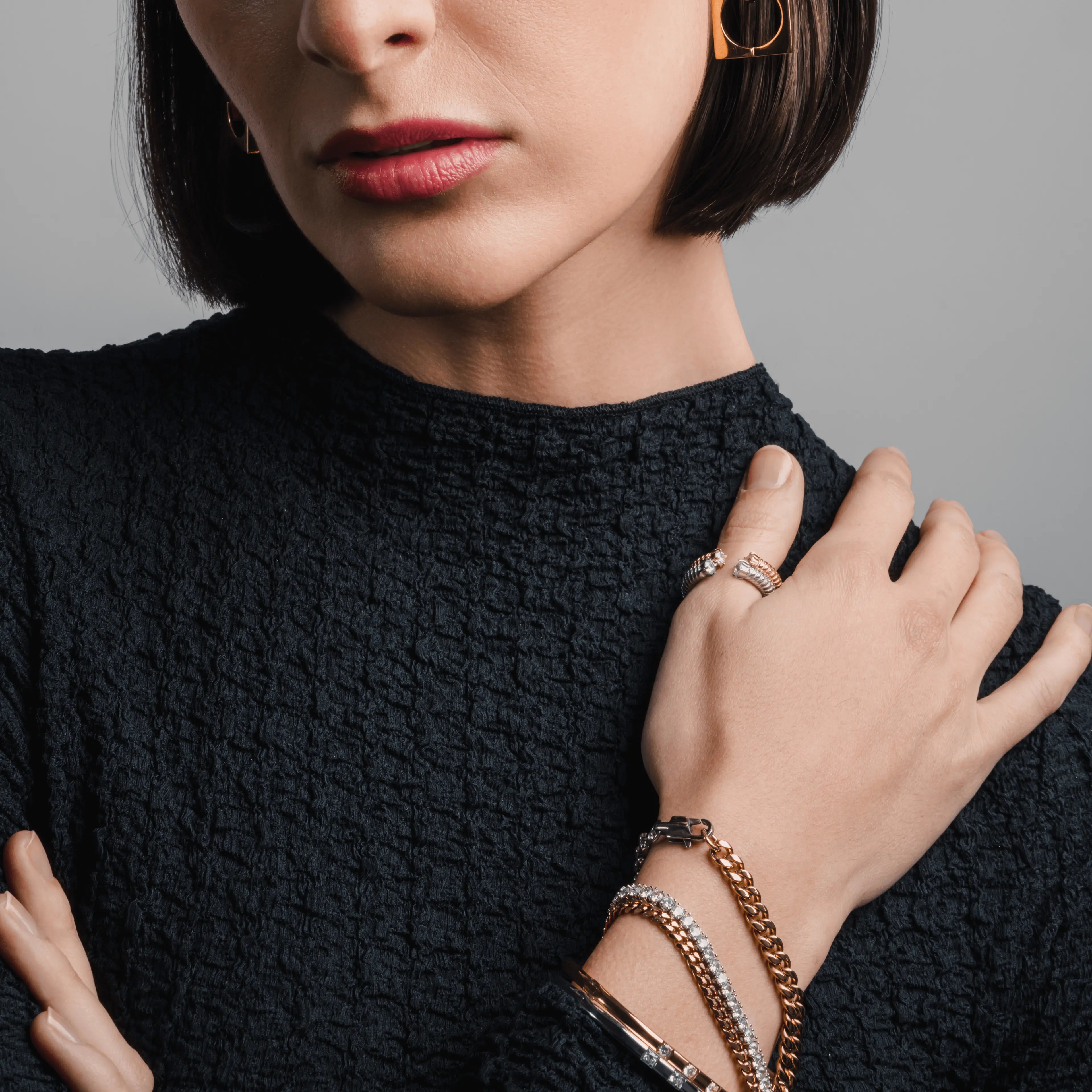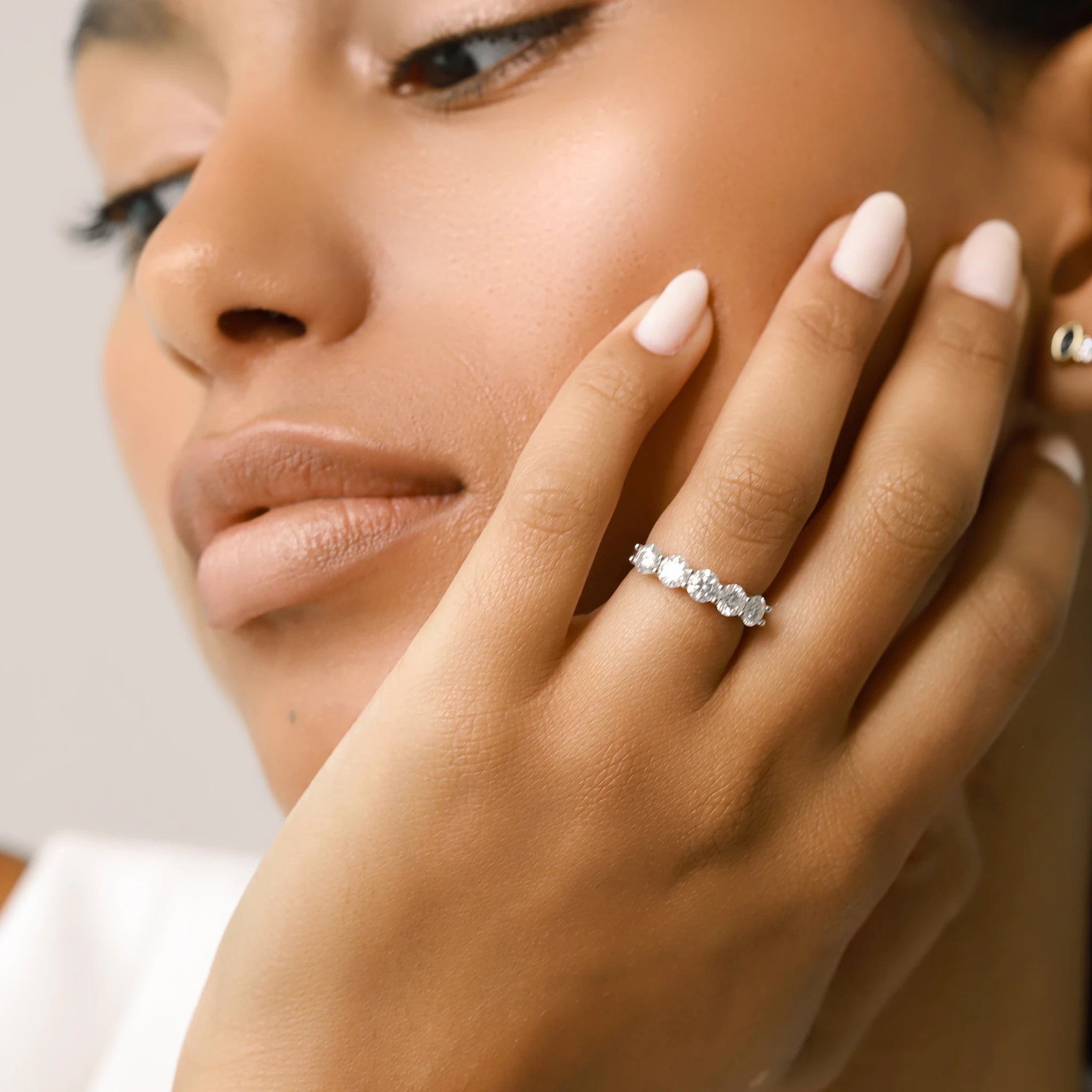 Model wearing the The BOLD ETERNITY DIAMOND RING, a stunning silver ring featuring a full band of sparkling diamonds as well as the Abuela ring.