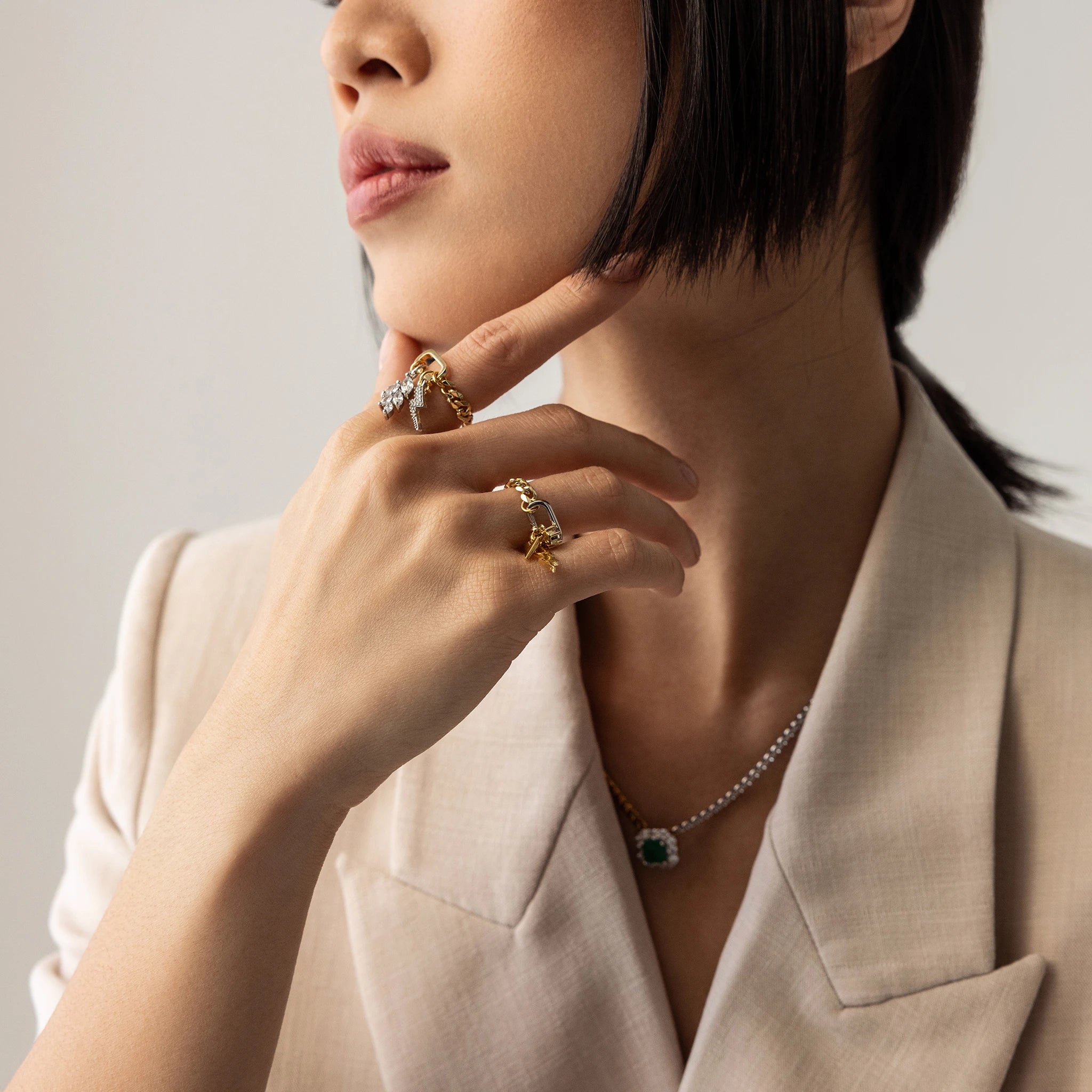 Model wearing HIGH PEAK RING SET in gold and silver paired with the Anne Mix Necklace, featuring a silver chain and gold carabiner, styled with a bold and edgy vibe.