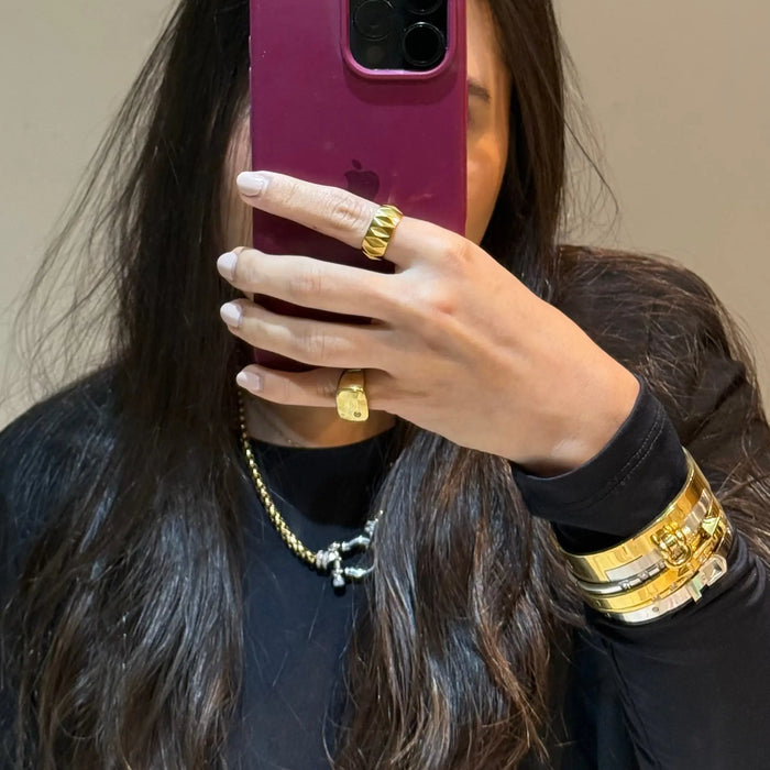 There are many ways to stack your bracelets. The most common is to start with a main piece, a standout bracelet or your favorite watch, and layer others around it. You can also mix metals and textures, combining cable, curb chains, bangles, pavé details, and different structures, from rigid bangles to flexible chains. If you’re new to stacking, the easiest way to start is with pre-styled jewelry stacks that already create the perfect balance.