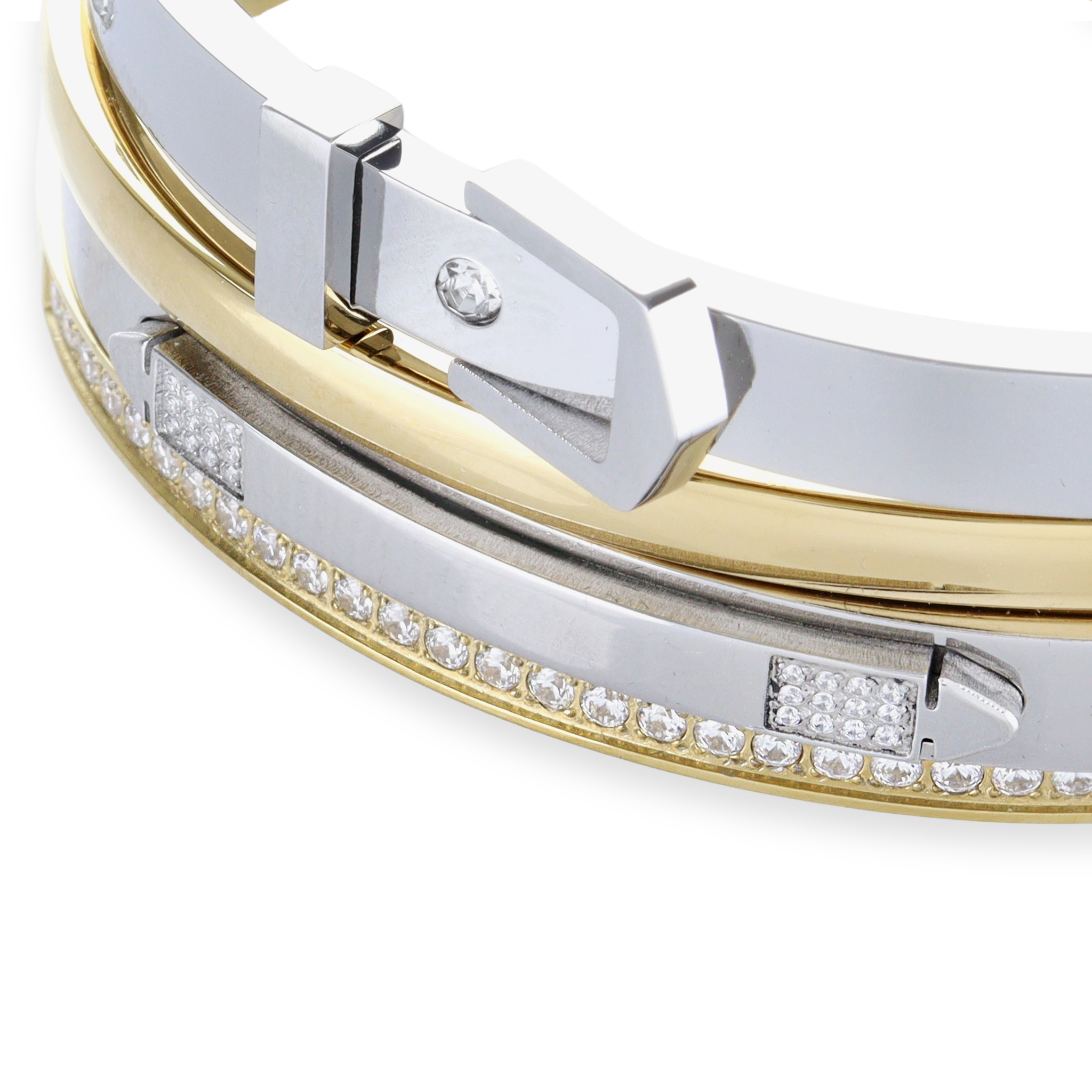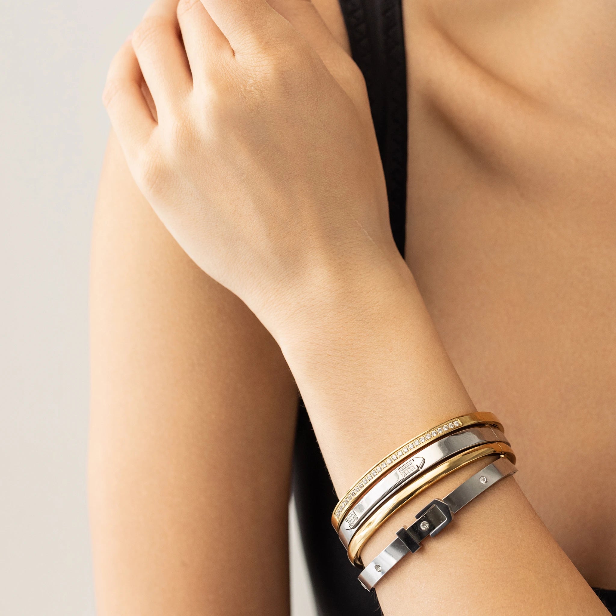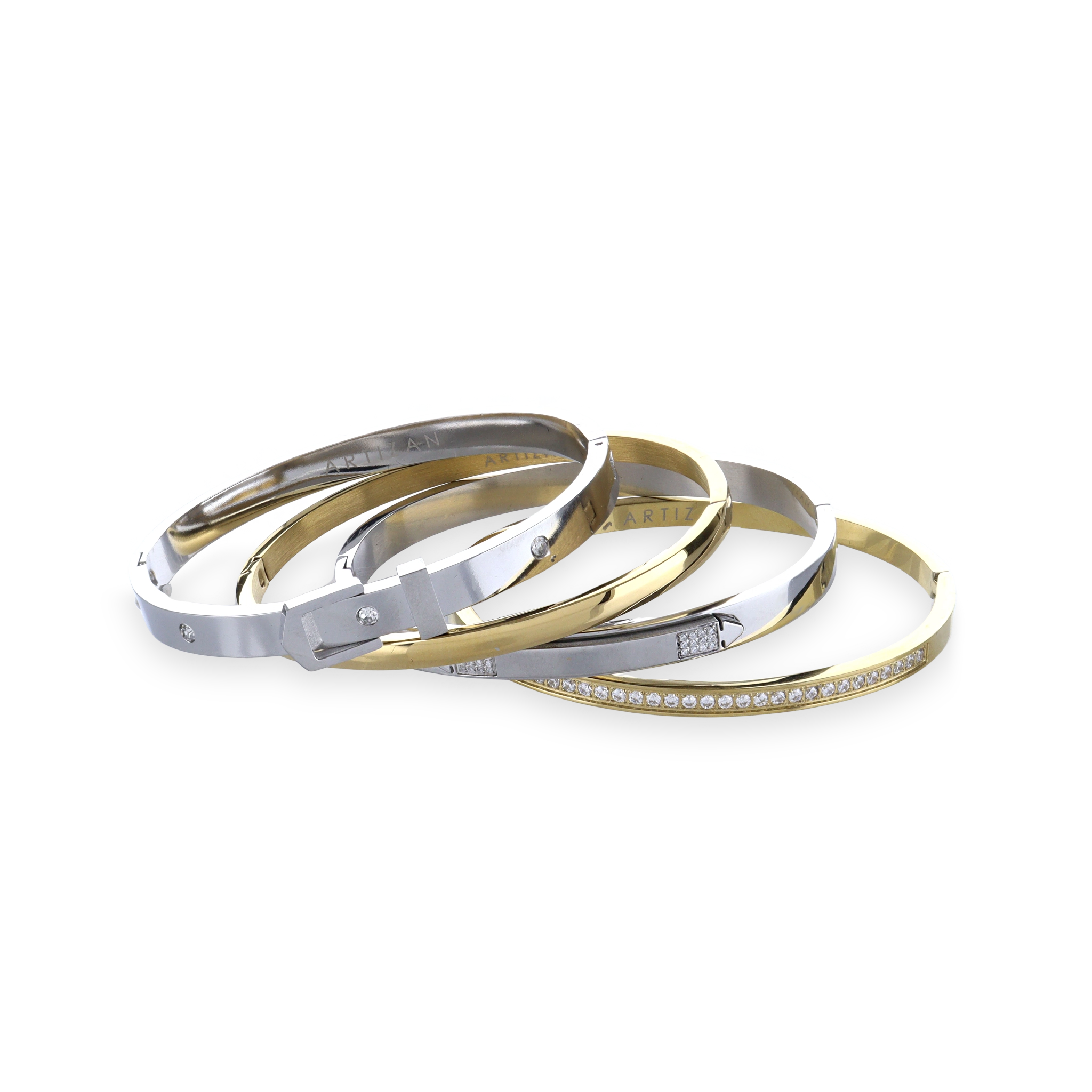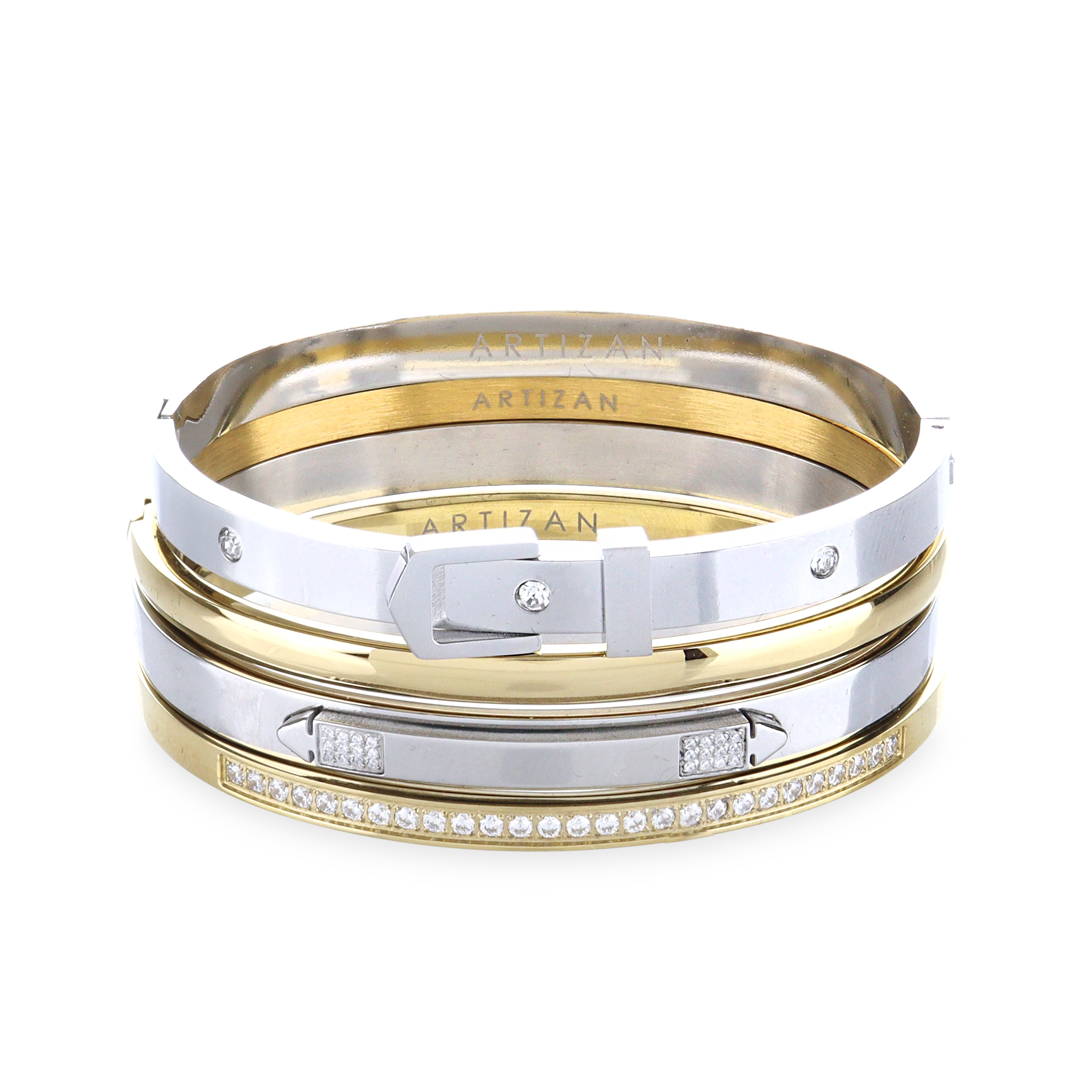 This is the perfectly balanced bracelet stack that you won’t need to take off. The set includes 4 bangles, made from 18k Gold plated stainless steel and Rhodium plated stainless steel with encrusted Zirconia stones.