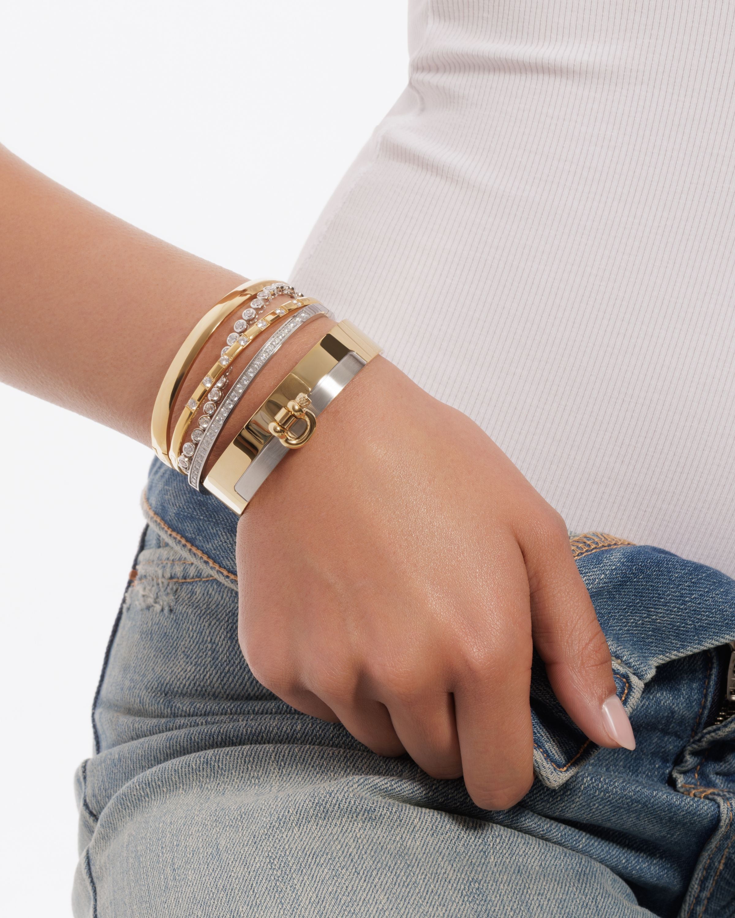 There are many ways to stack your bracelets. The most common is to start with a main piece, a standout bracelet or your favorite watch, and layer others around it. You can also mix metals and textures, combining cable, curb chains, bangles, pavé details, and different structures, from rigid bangles to flexible chains. If you’re new to stacking, the easiest way to start is with pre-styled jewelry stacks that already create the perfect balance.