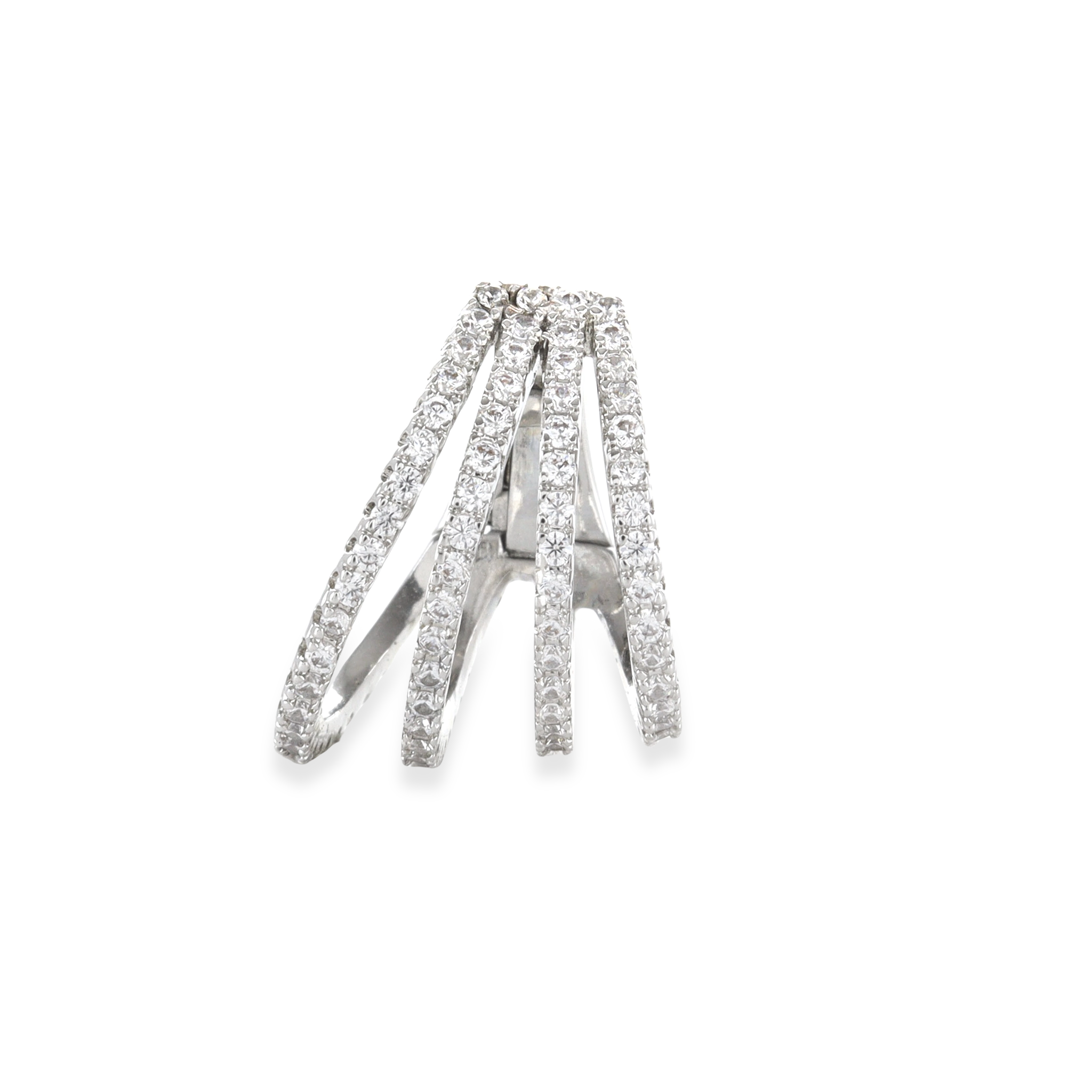 The Eternity Ear Cuff, a single silver ear cuff featuring multiple rows of sparkling round crystals in a pavé setting. This elegant cuff offers a bold, shimmering look without the need for a piercing, making it a versatile addition to any earring stack or worn solo for a statement effect.