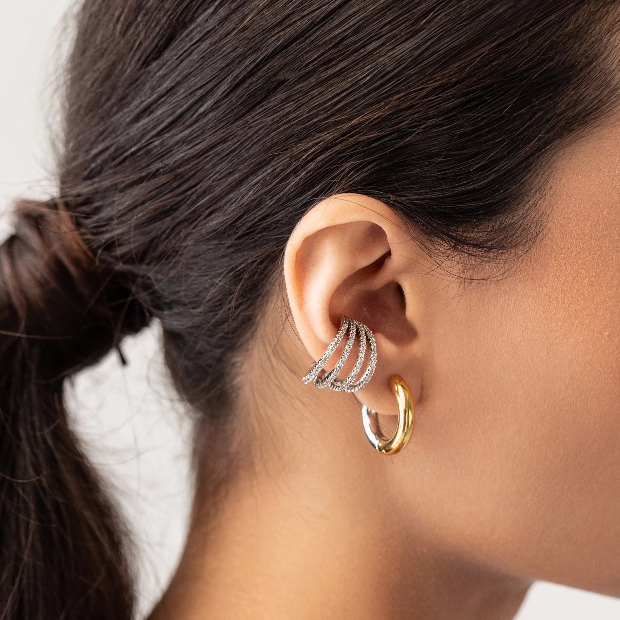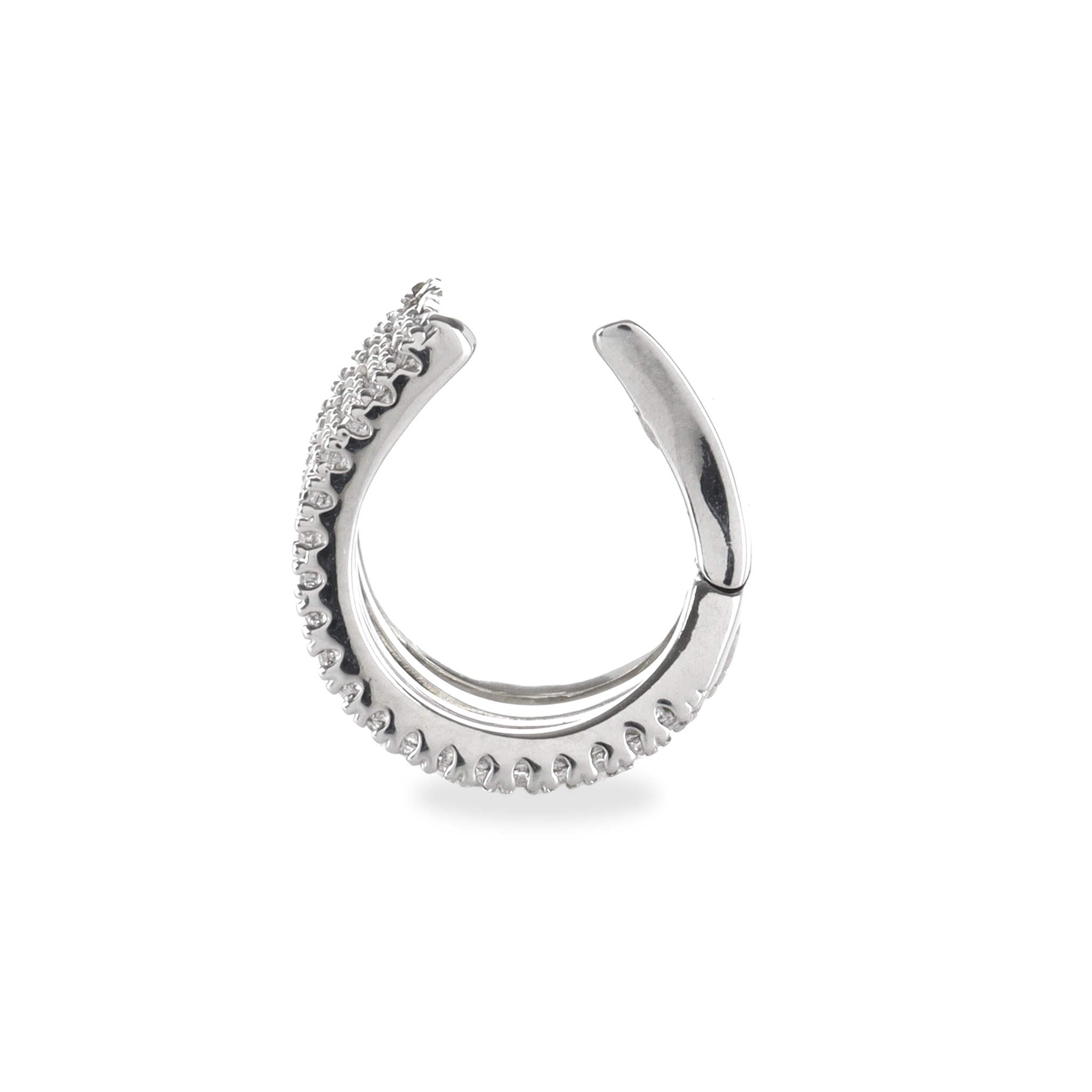 The Eternity Ear Cuff, a single silver ear cuff designed with three rows of sparkling round crystals in a pavé setting. This luxurious cuff adds a bold, layered effect to the ear, perfect for creating a statement look without the need for multiple piercings.
