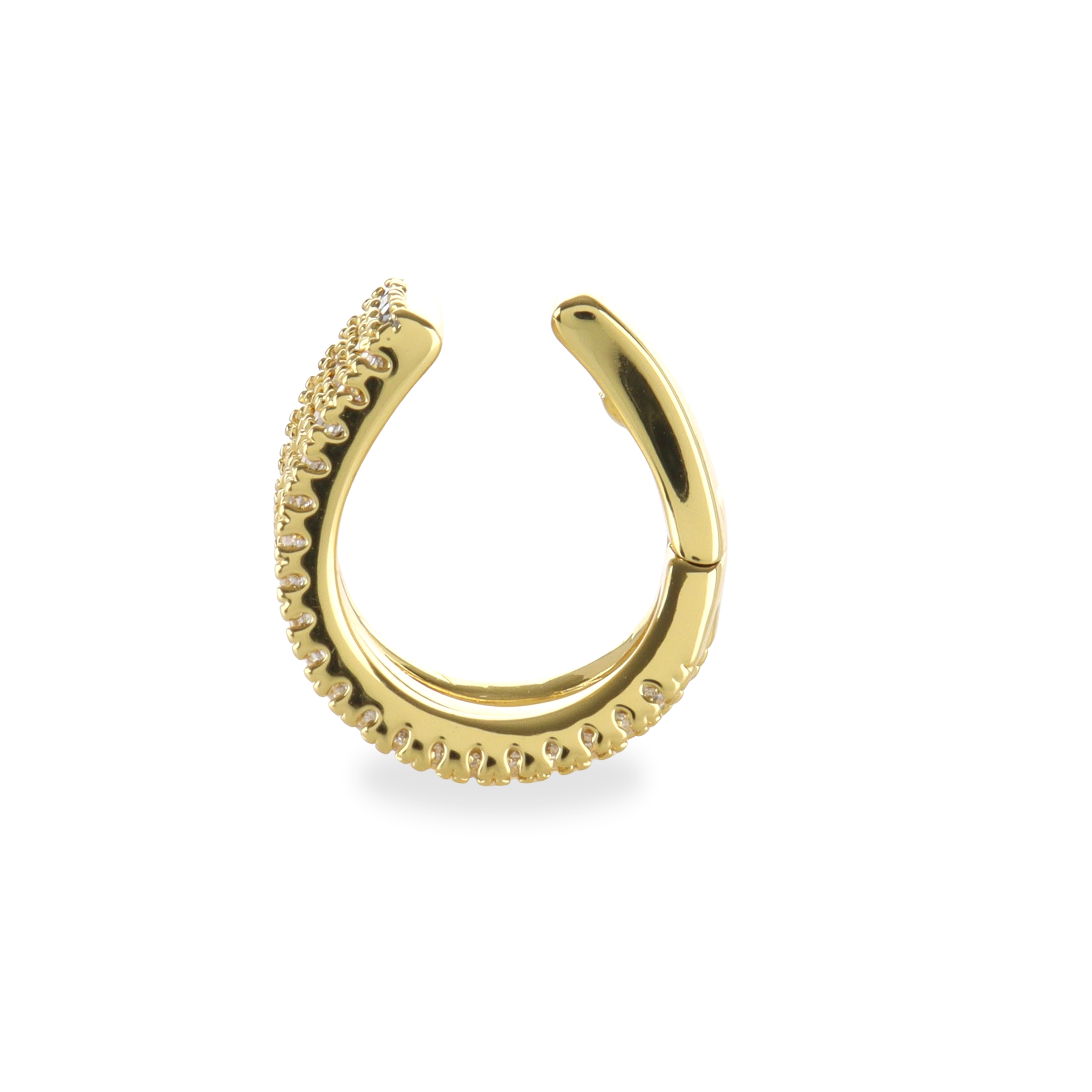 The Full Eternity Ear Cuff, a bold gold-tone cuff adorned with sparkling stones, offering a statement look without piercings.|||Gold