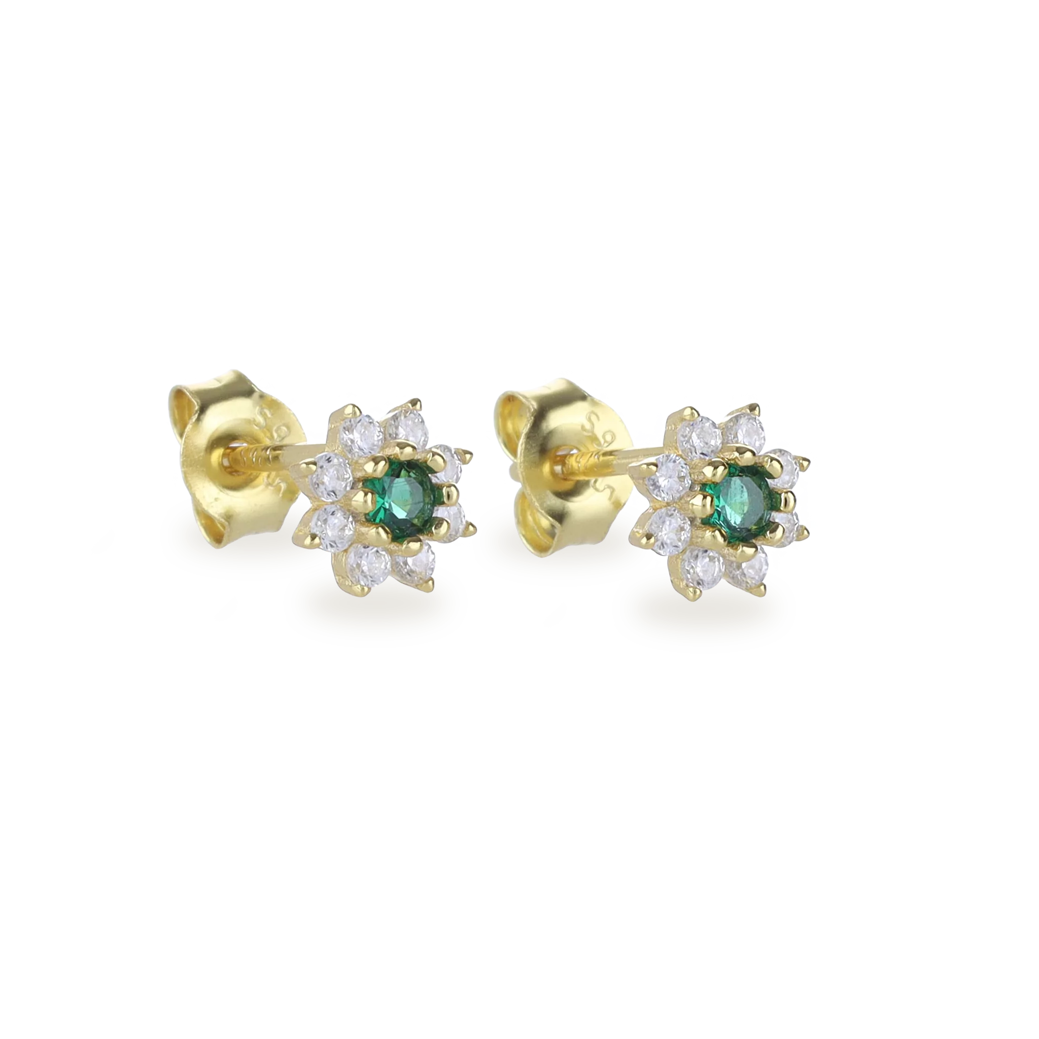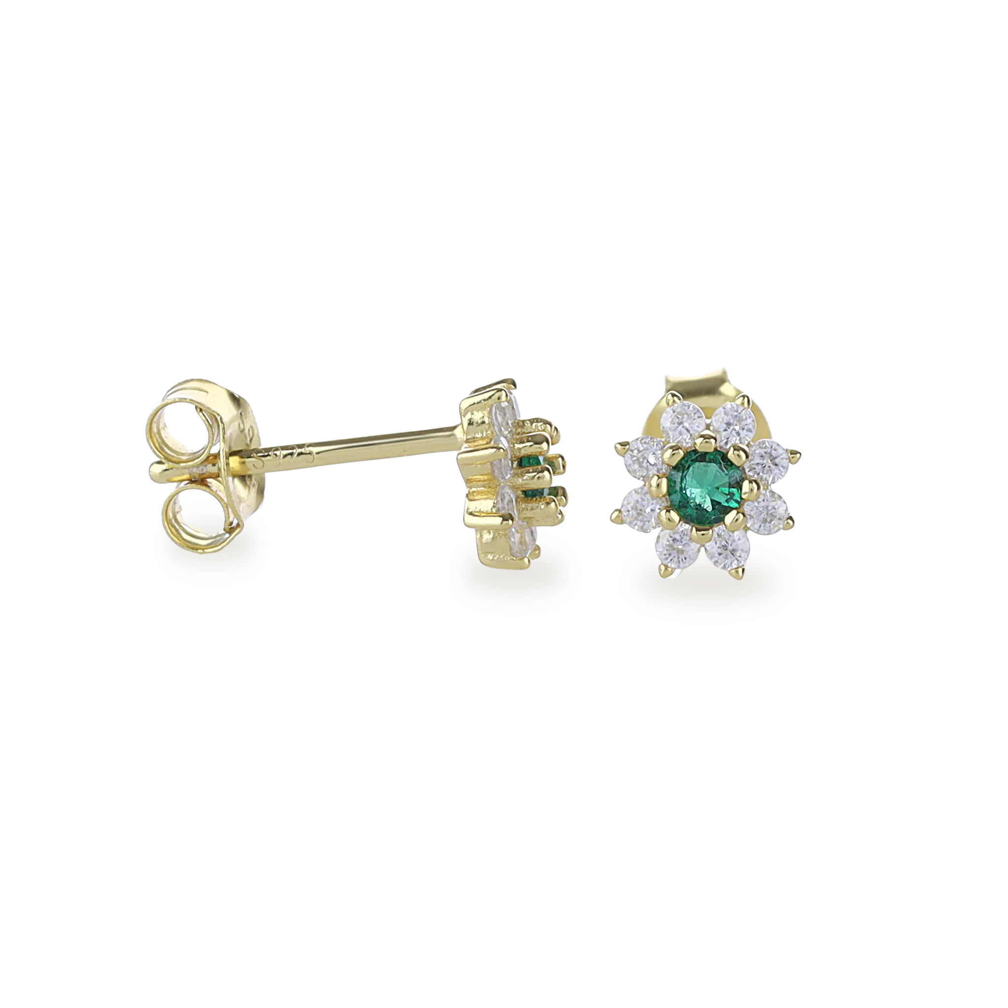 The Emerald Flower Stud Earrings, a pair of elegant gold earrings featuring a central green emerald surrounded by petal-like sparkling white stones in a floral design. These dainty stud earrings add a touch of sophistication and timeless beauty, perfect for any occasion.