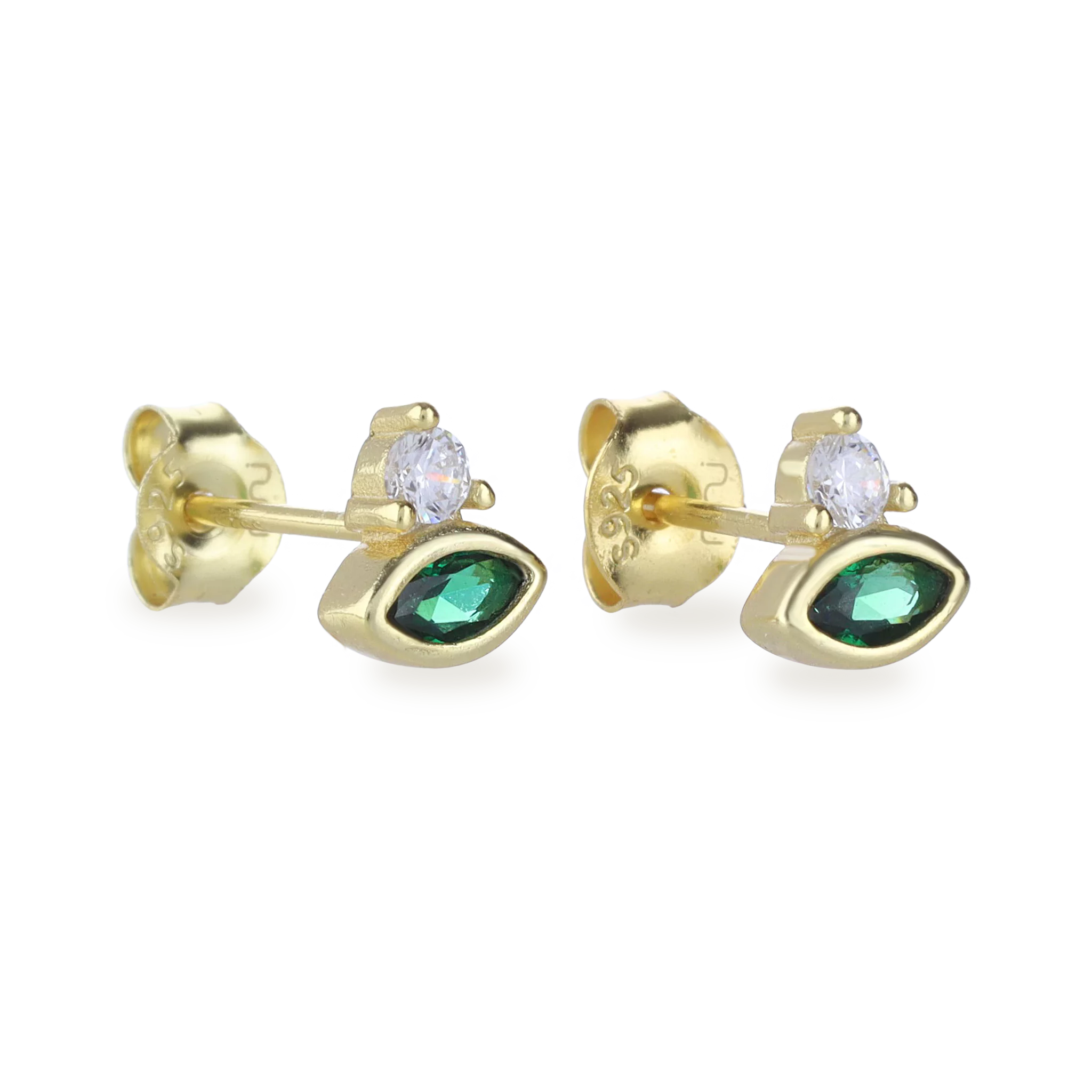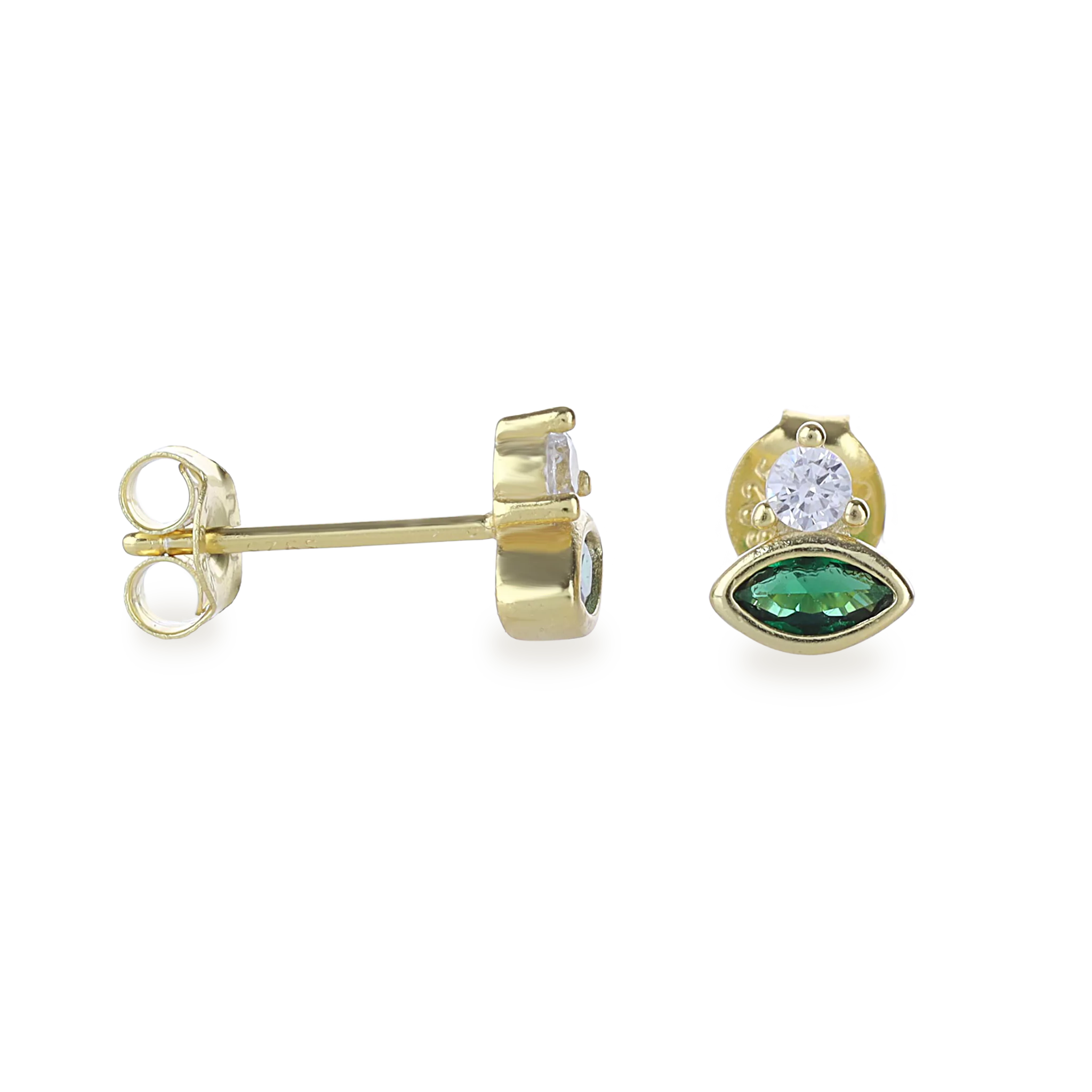 The Emerald Oval Stud Earring, a pair of elegant gold earrings featuring a marquise-cut green emerald complemented by a round white crystal above. This unique design combines classic shapes with a modern touch, making it a versatile accessory for any look.