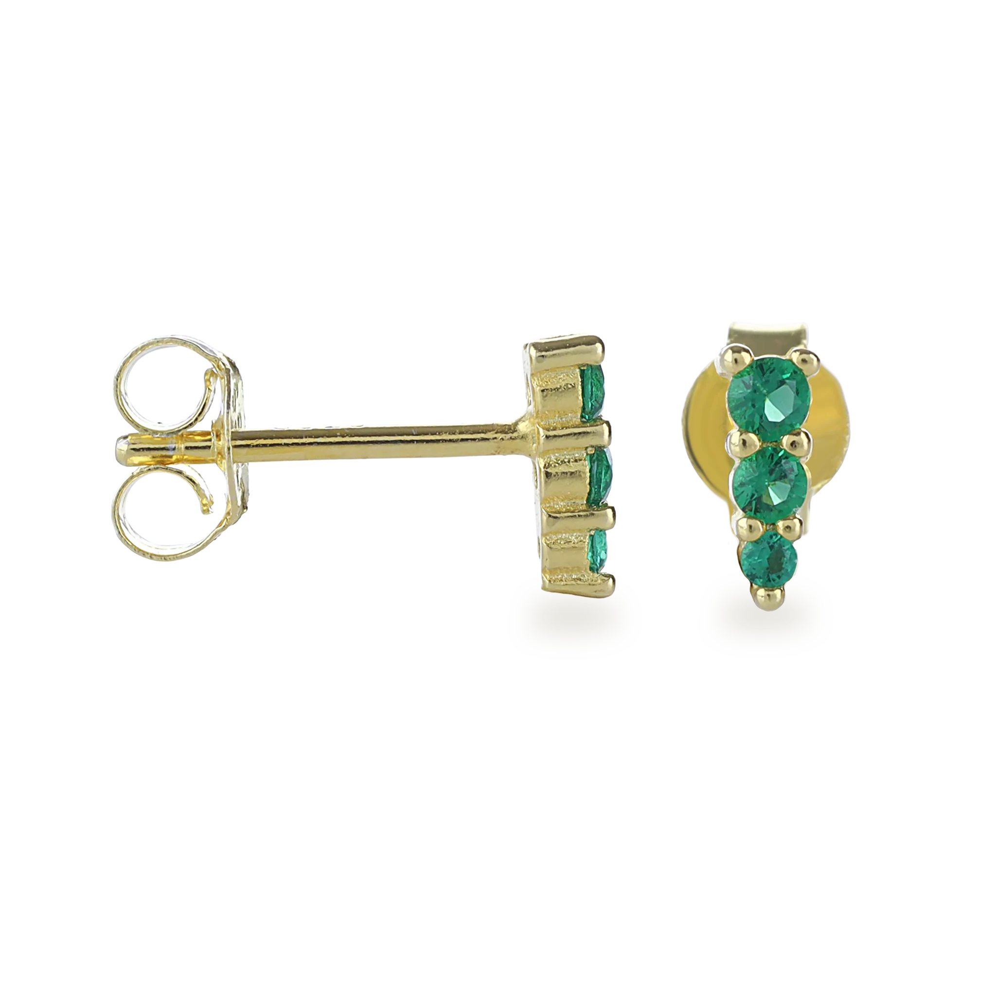 The Emerald Pyramid Stud Earring, a single gold stud featuring a trio of vibrant green emerald stones arranged in a vertical pyramid shape. This modern and eye-catching design adds a unique geometric element to any look, perfect for stacking or wearing alone as a bold statement piece.