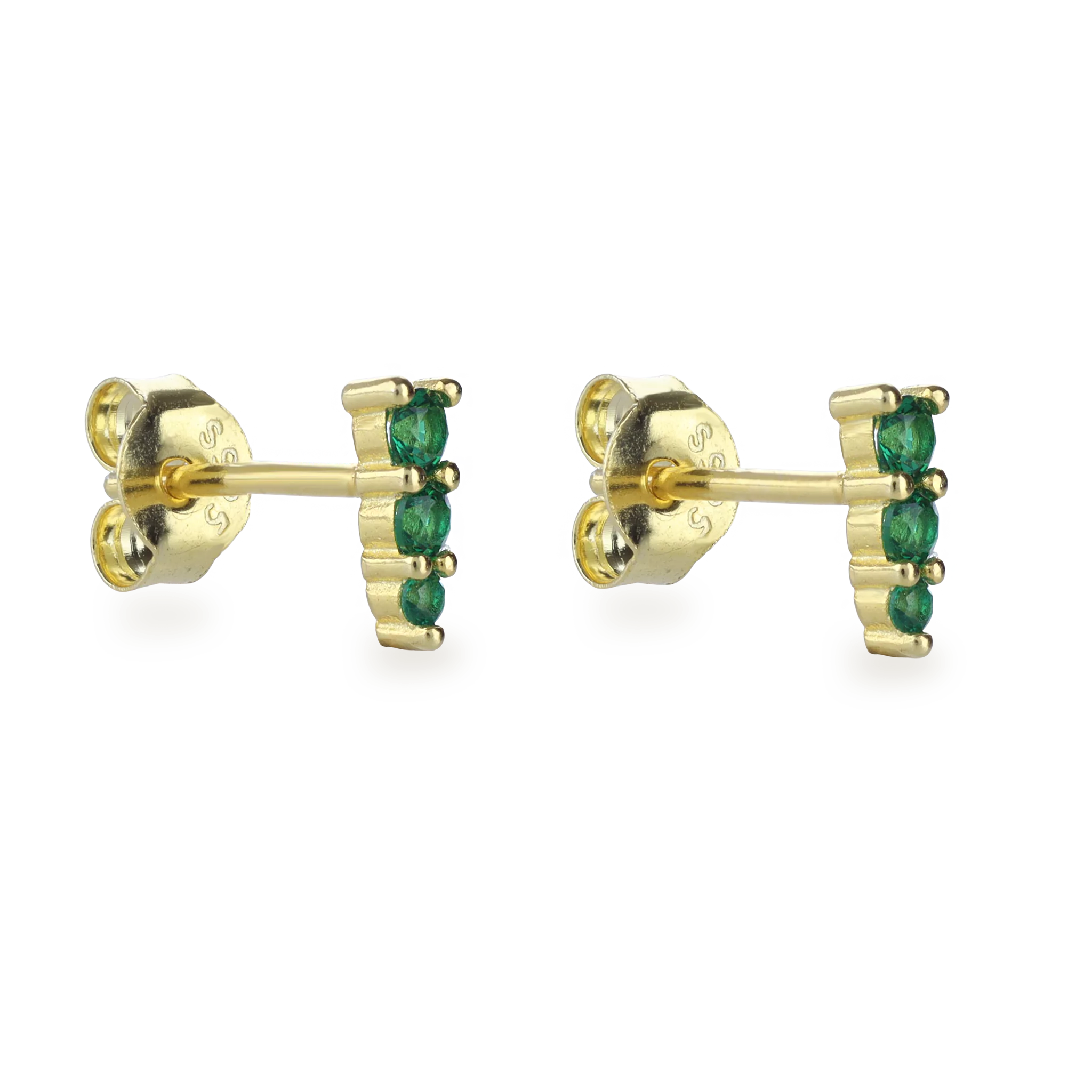 The Emerald Pyramid Stud Earrings, a pair of gold studs featuring three vertically stacked green emerald stones in a sleek pyramid arrangement. These elegant earrings offer a modern, geometric style, adding a pop of vibrant color to any outfit while maintaining a sophisticated and minimalistic look.