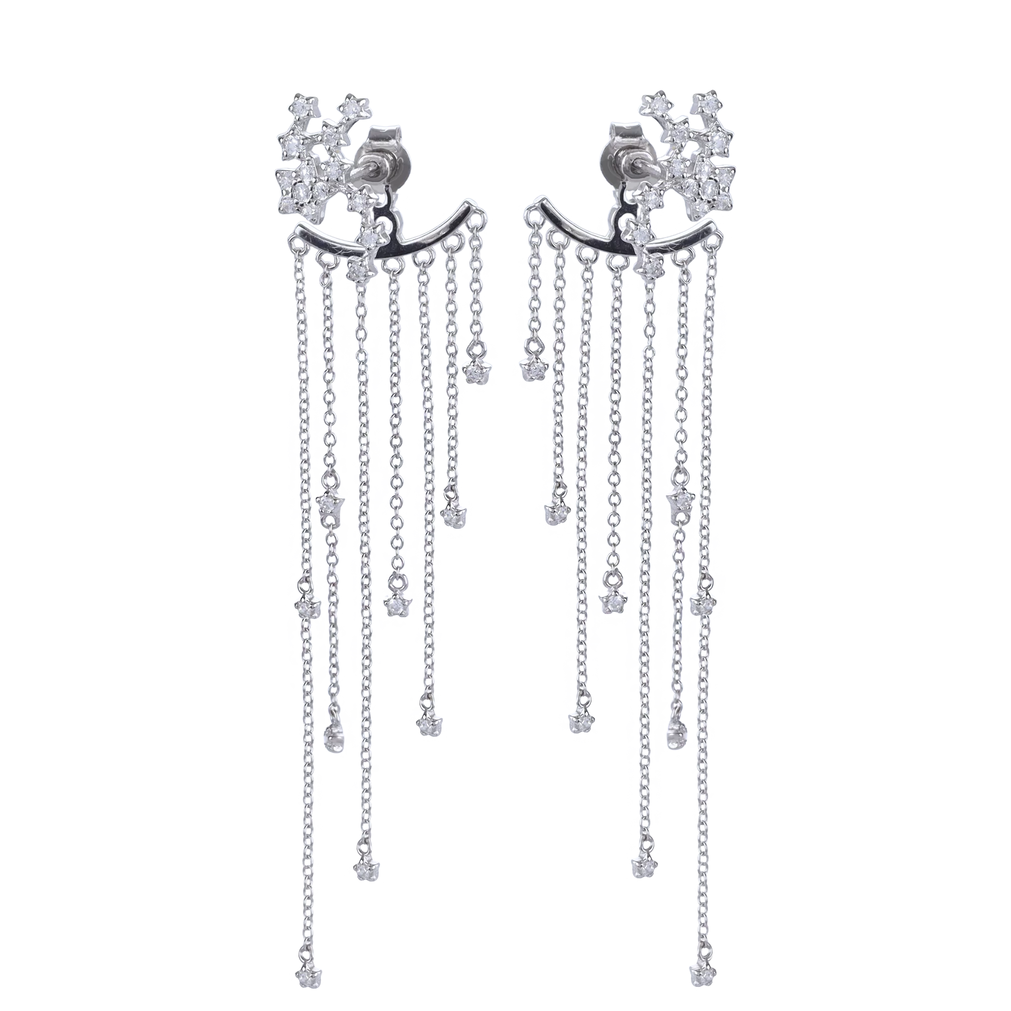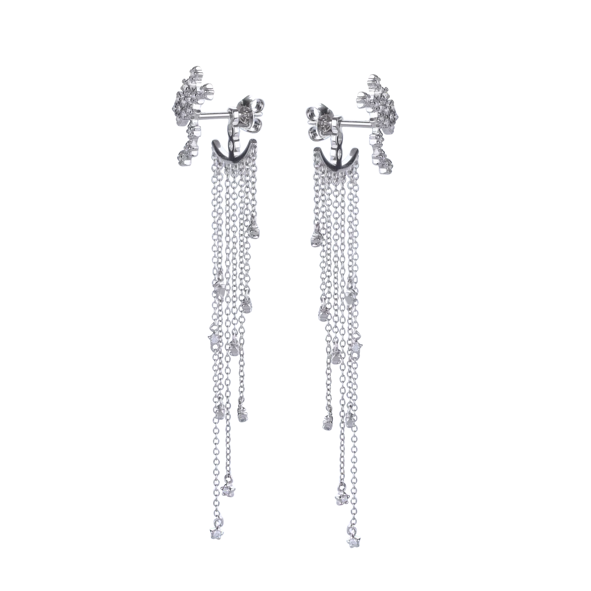 The Rain Drop Earrings, a pair of silver earrings featuring cascading chains with diamond-like accents.