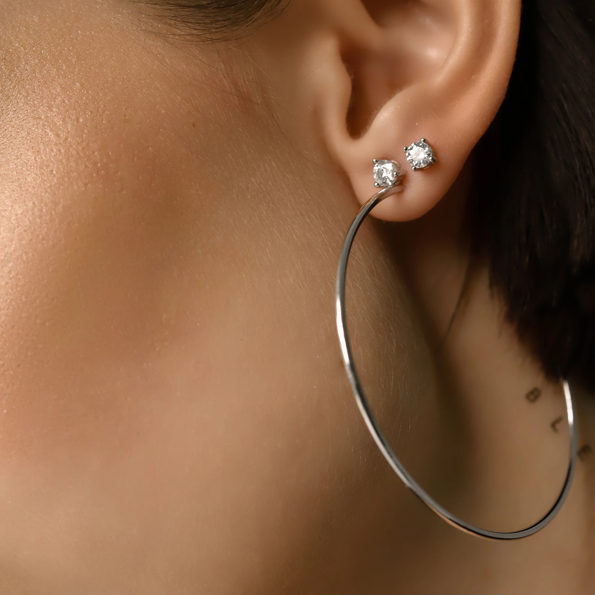 The Solitaire Hoop, a pair of silver hoop earrings with a diamond-like stone stud.