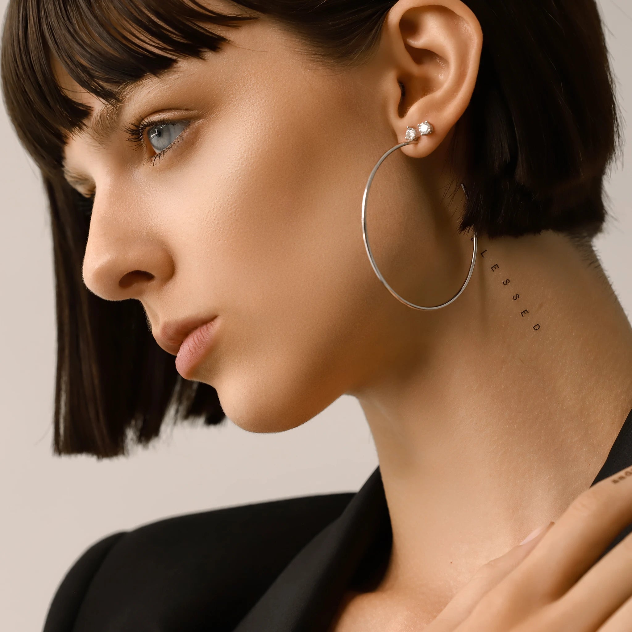 Model wearing The Solitaire Hoop, a pair of silver hoop earrings, with two diamond-like stone studs.