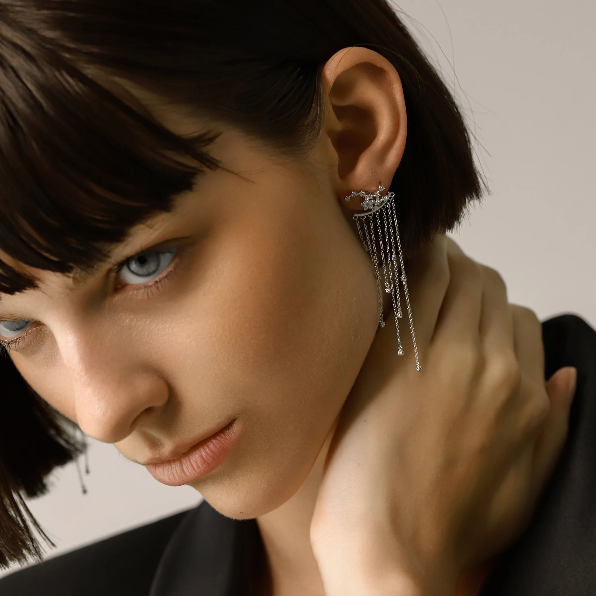 Model wearing the Rain Drop Earrings, a pair of silver earrings featuring cascading chains with diamond-like accents.
