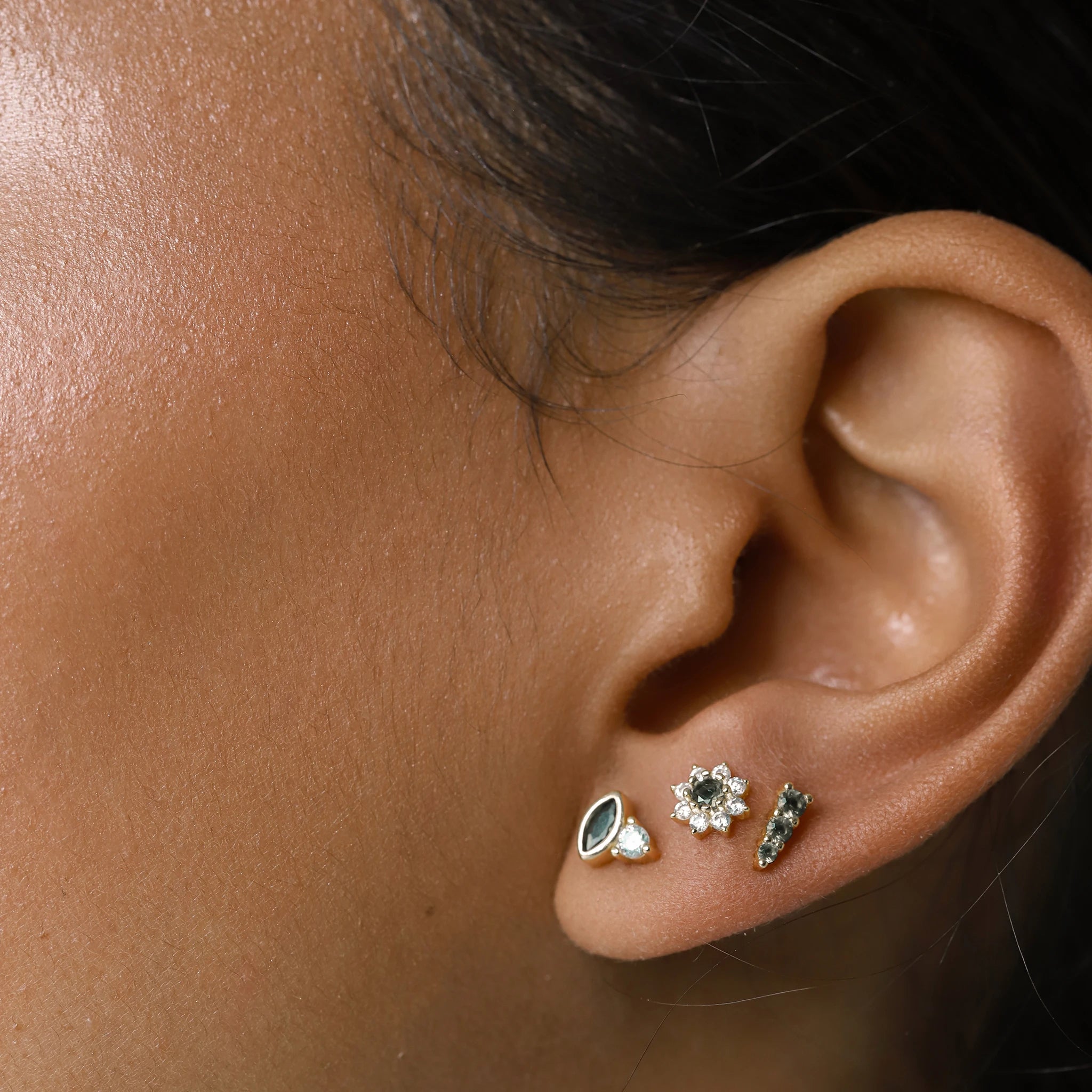 The Emerald Flower Stud Earring, shown as part of an ear stack with three other gold and black gemstone earrings. This dainty gold stud features a green emerald at the center, surrounded by a halo of sparkling stones in a floral design, adding an elegant and unique touch to a layered ear look.