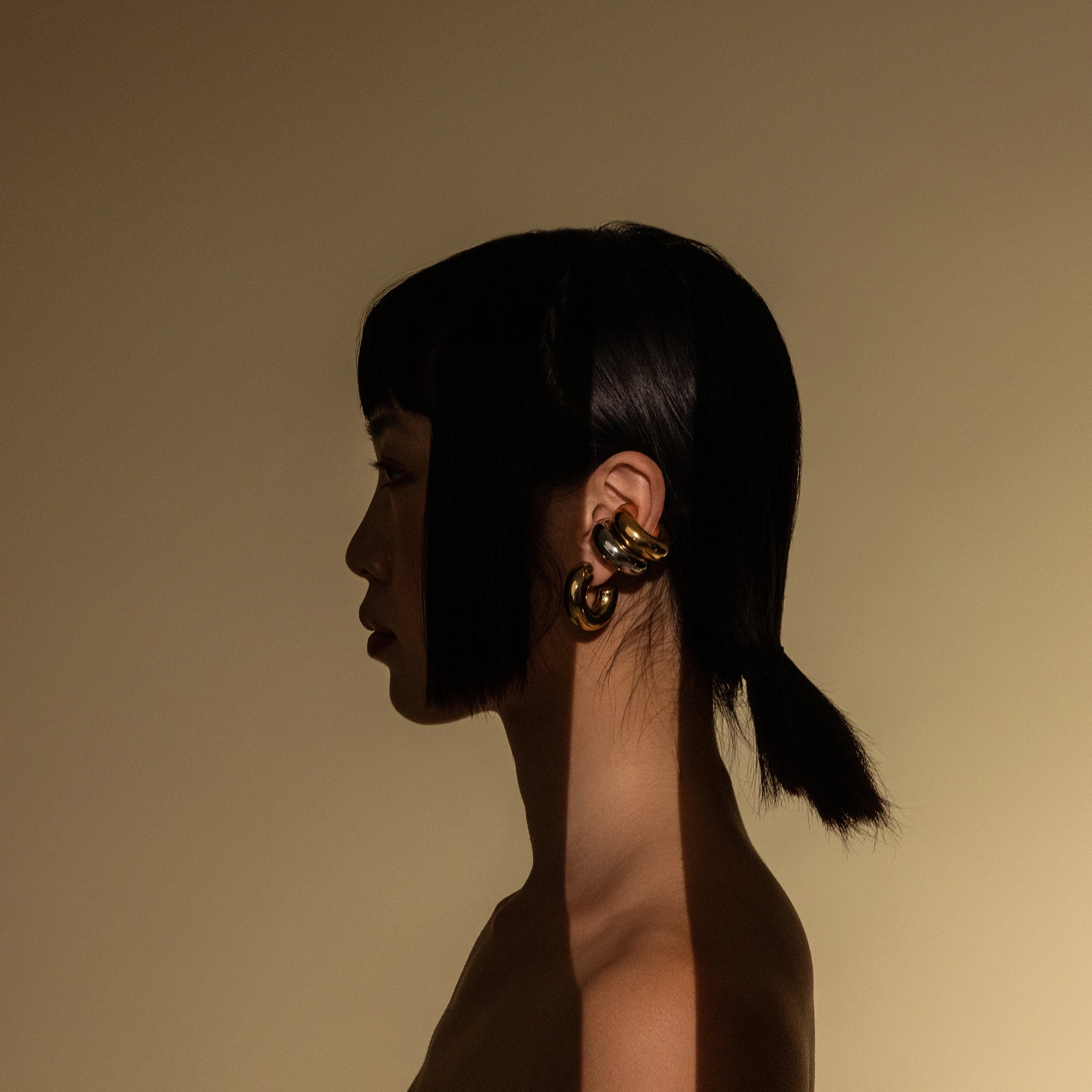 Model wearing three Chunky Bagel Ear Cuffs,  gold and silver ear cuffs with a thick, rounded design.