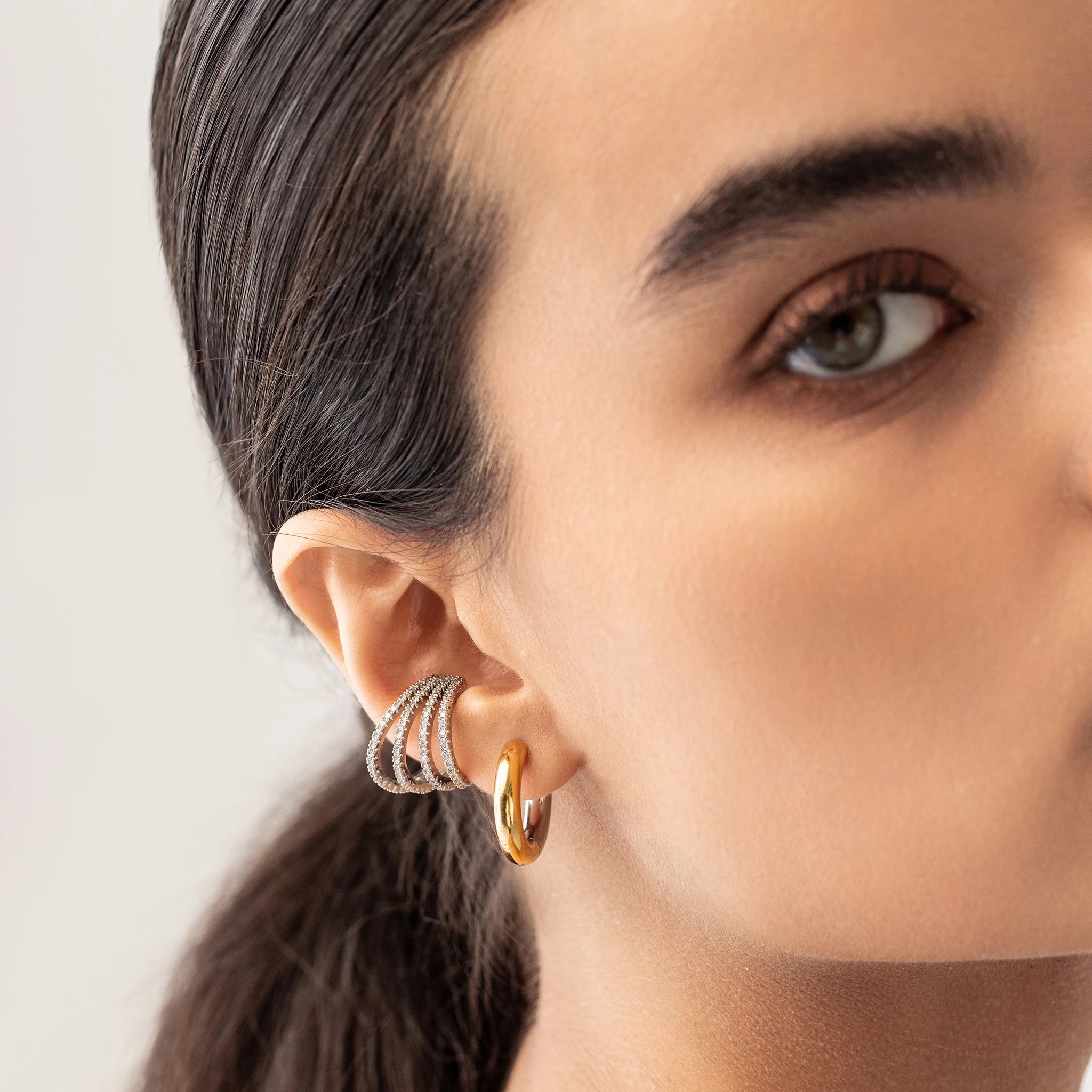 Model wearing the SAVERS EAR CUFF which comes with two 18K gold plated copper ear cuffs, 0.5mm in width and one 18k gold plated trebol huggies.