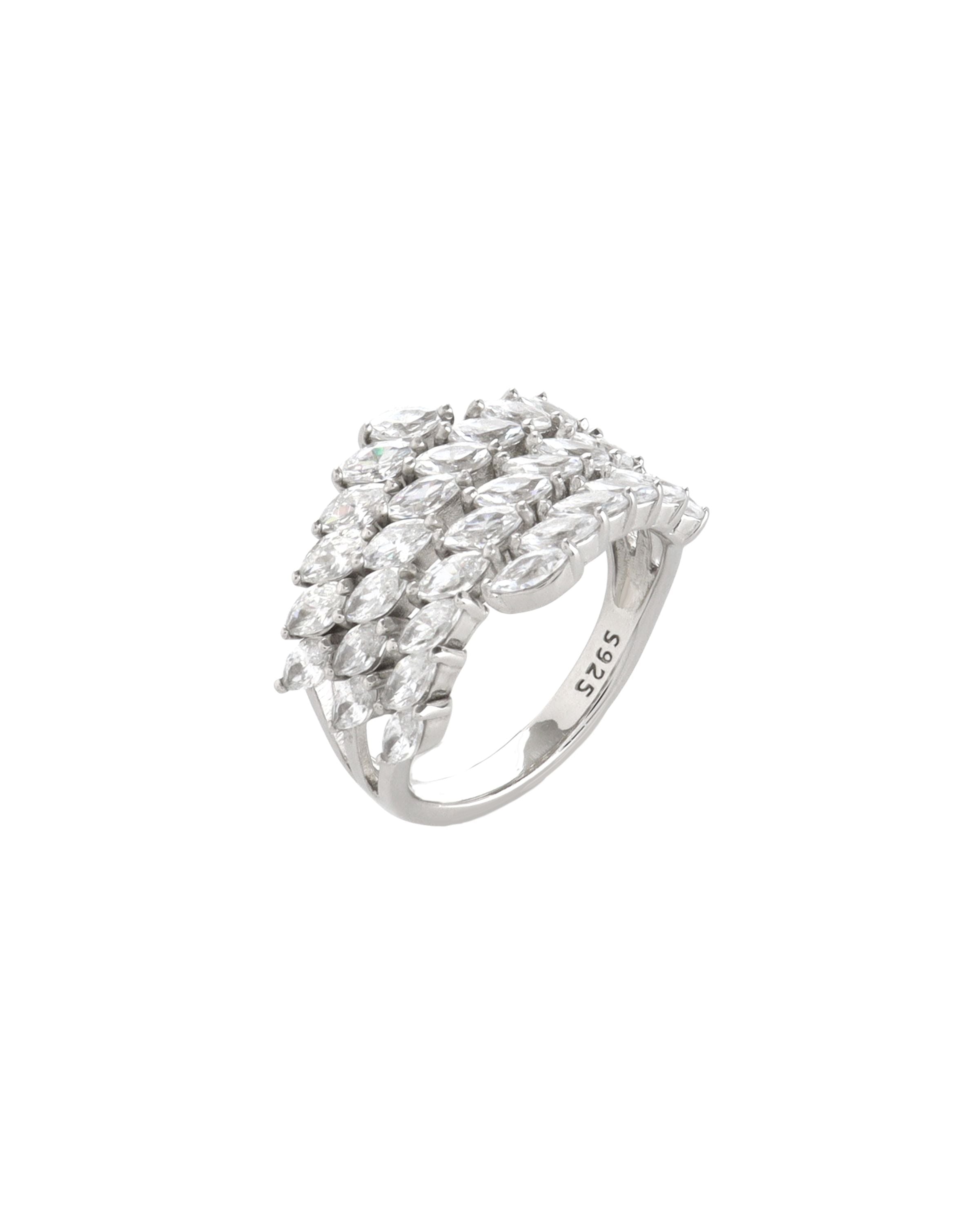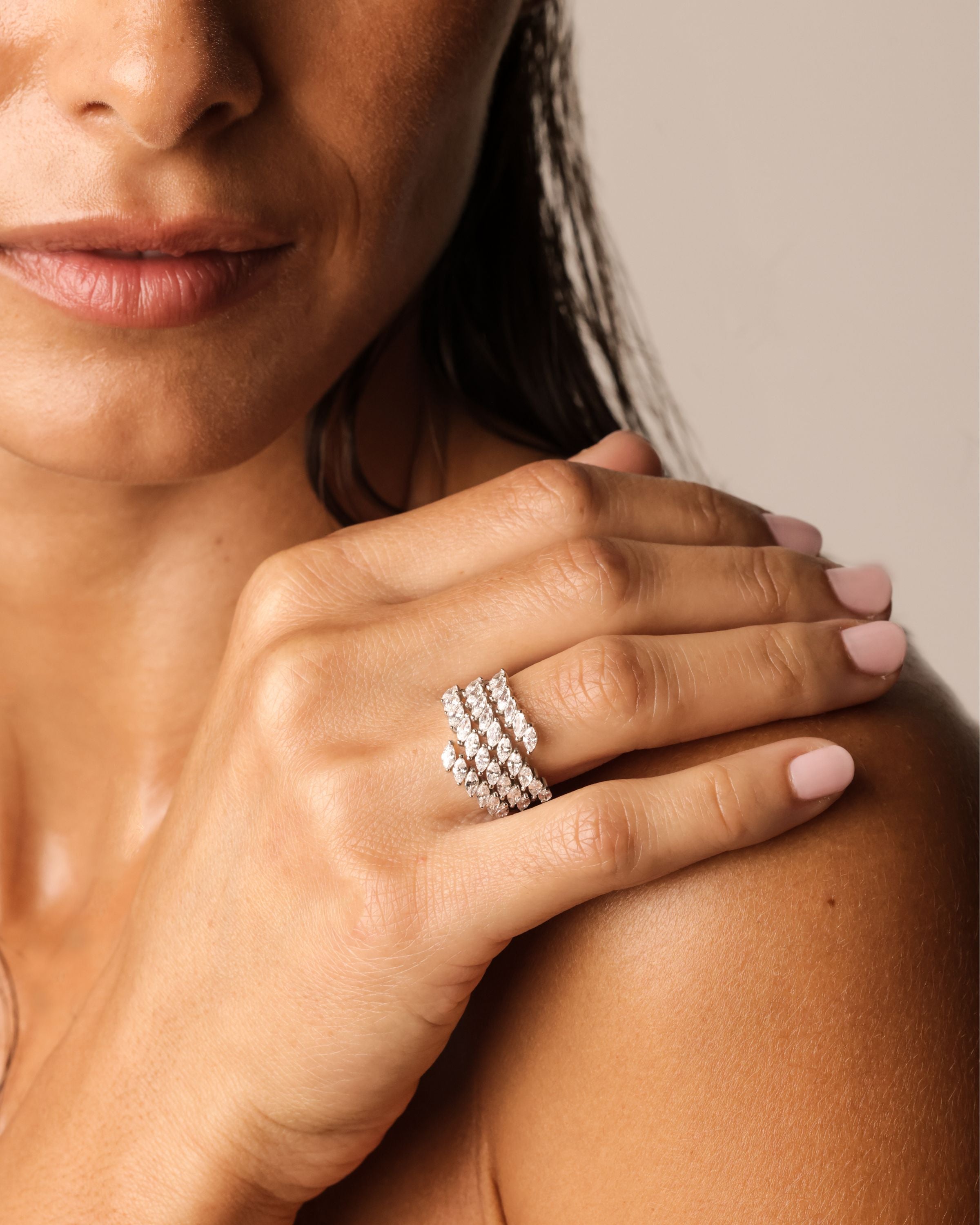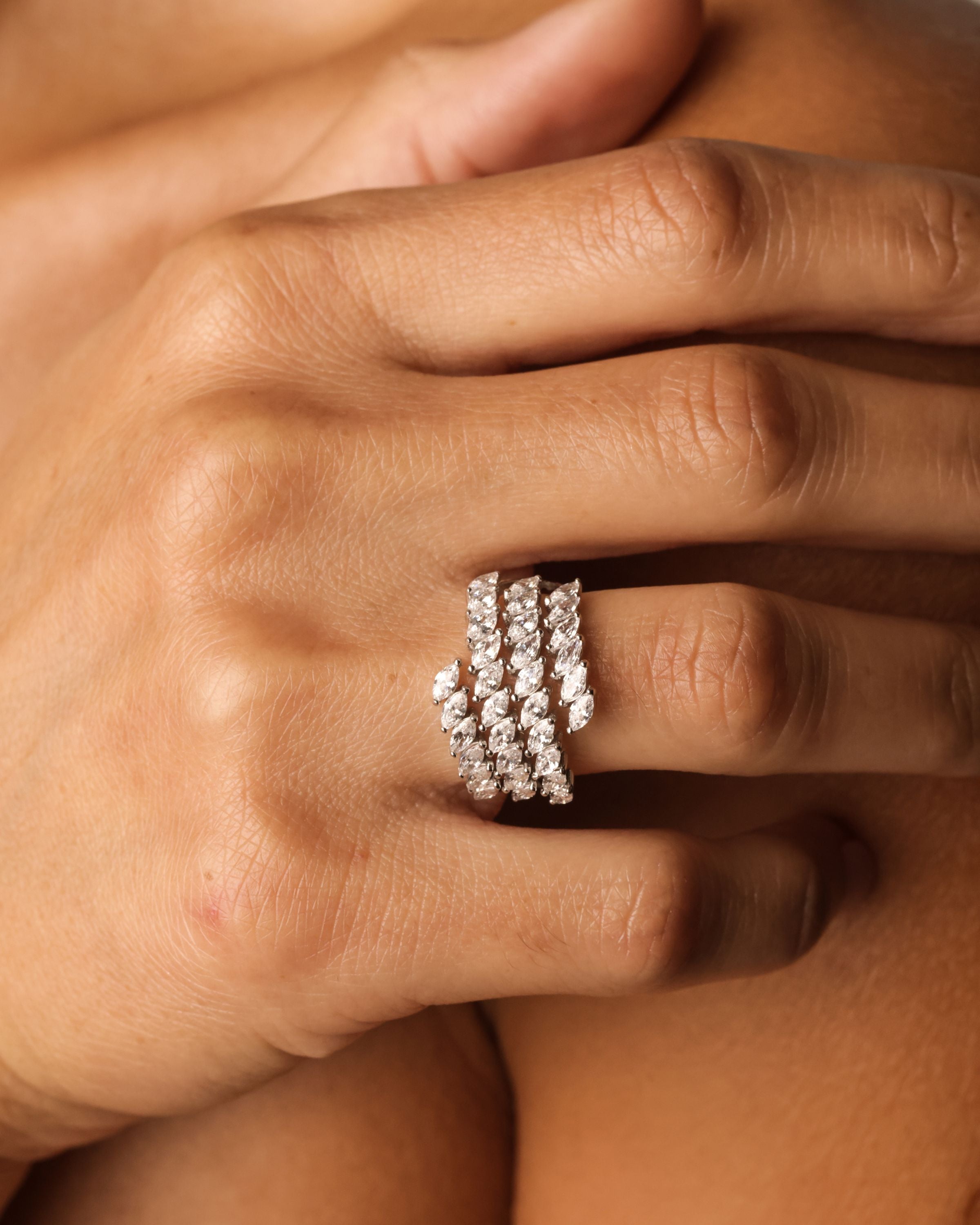 The Triple Eternity Diamond Ring, a silver ring with three rows of sparkling cubic zirconia stones.