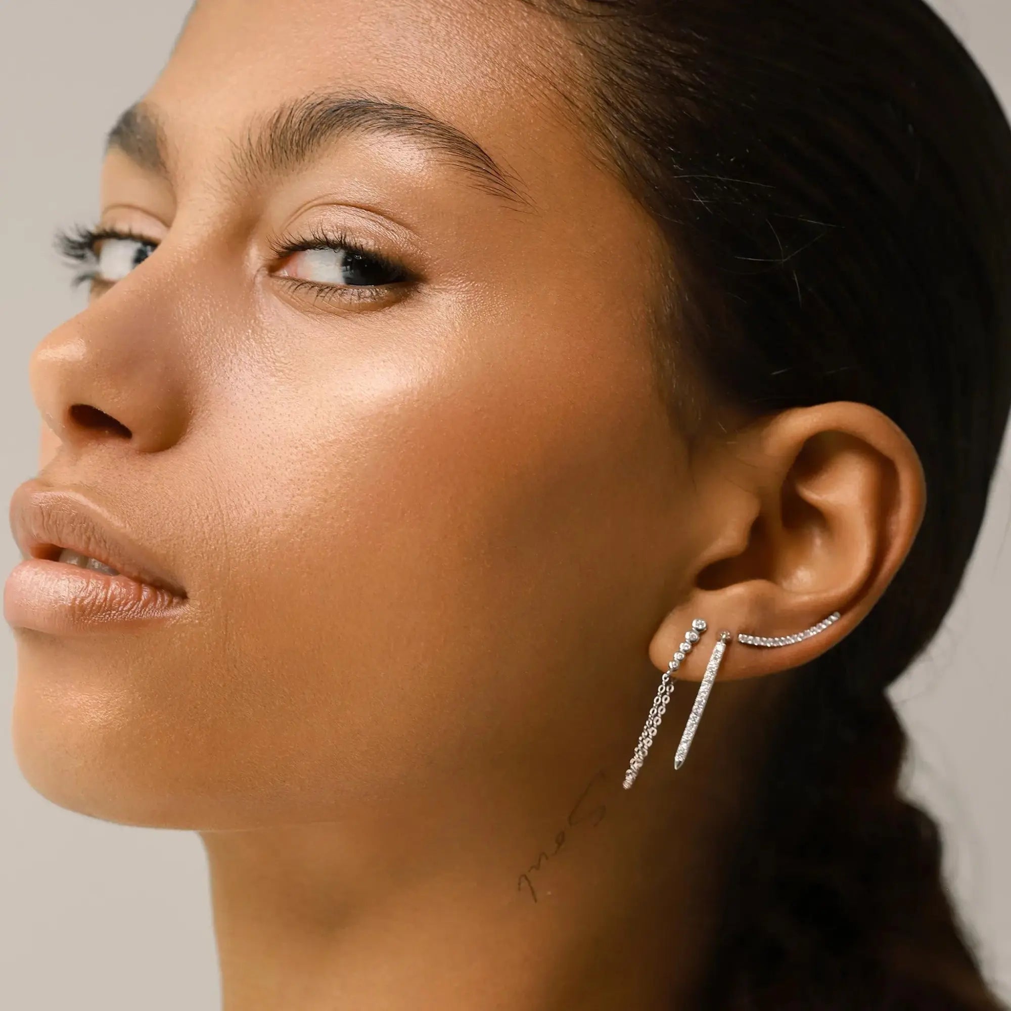 Model wearing the Triplet Solitaire Ear Stud, a  silver stud earrings each with three cubic zirconia stones in a curved design, a tiny diamond hoop earring and an ear cuff with loose tiny chains around.