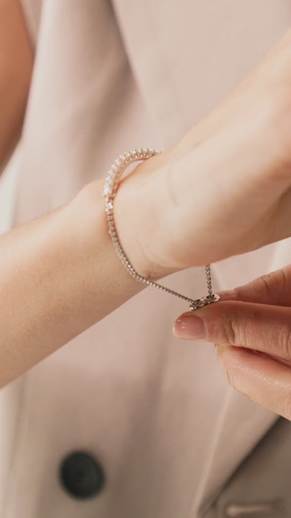Model wearing the LUXURY TENNIS BRACELET which is made of 925 sterling silver and 3mm Shimmering cubic zirconia individually set in lustrous sterling silver links. She is also wearing the Thin Tennis Bracelet with it.