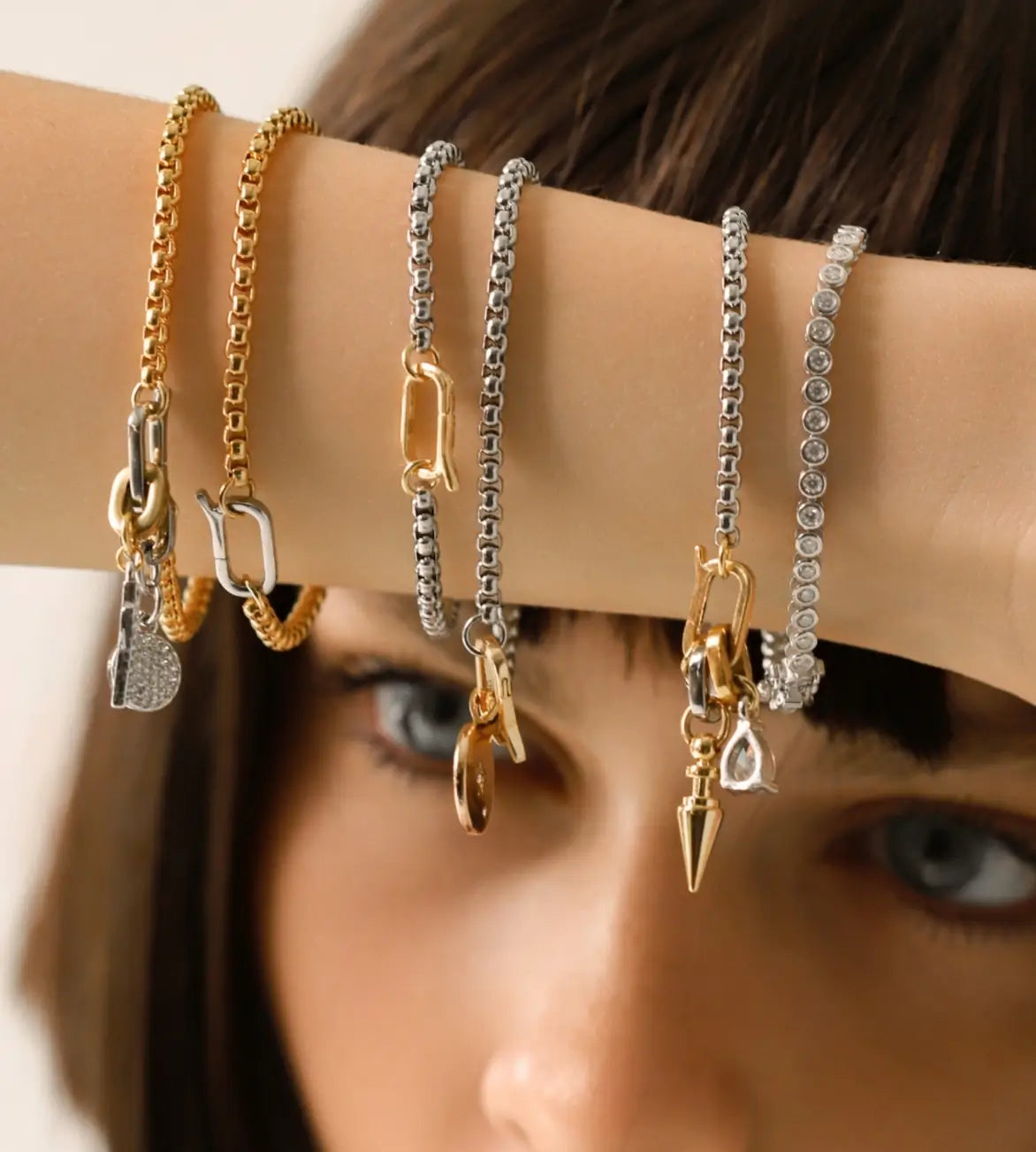 Model wearing the Chain Reaction Bracelet Stack featuring gold and silver chains with diamond-encrusted charms, including a snowflake, teardrop, and triangle.
