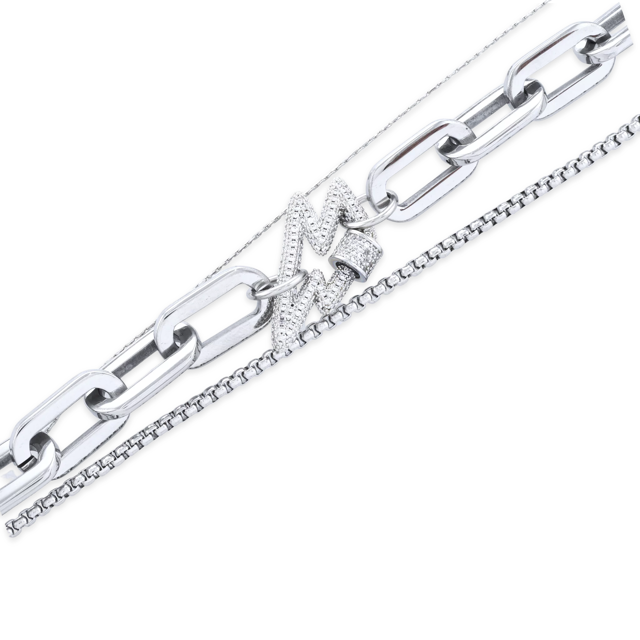 The SHINE PUERTO NECKLACE SET, which is a striking three-piece layered necklace in a polished silver finish. This set features bold chain links, a sparkling lightning bolt charm, and delicate accents, creating a perfect blend of edgy and elegant styles for versatile wear.