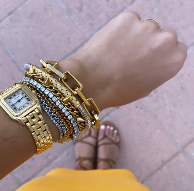 Model wearing a watch and the BLENDED LUX SET which comes with 4 bracelets. The Crema blended which is half silver and gold with gold plated zirconia evil eye pendant, Marocchino blended which is an 18k gold plated chain with Zirconia solitaire,star and spike charms, tennis bracelet which is made of Rhodium-plated brass/cubic zirconia and Lungo blended bracelet which is Half stainless steel and half 18k gold plated chain with cubic zirconia and coin charms.