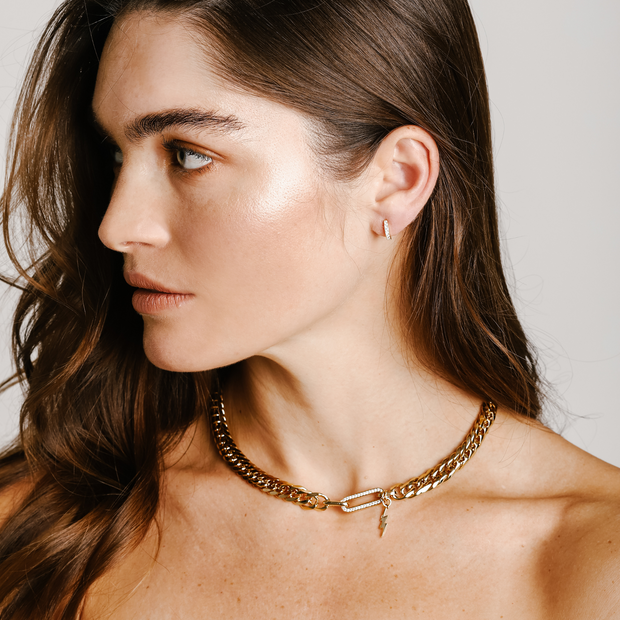Model is wearing a mini clear huggies silver and the PANAREA NECKLACE which is a 17" 18K gold plated stainless steel chunky chain with an 18k gold plated lightning charm and Zirconia charm.
