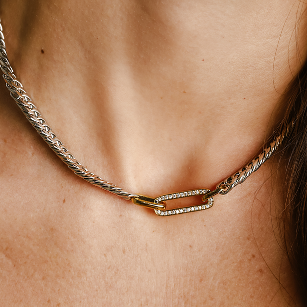 The Ischia Necklace, a single necklace featuring a chunky silver chain with a gold crystal-encrusted paperclip link accent. This mixed-metal design offers a modern and sophisticated look, blending silver and gold for a statement piece ideal for elevating any outfit.