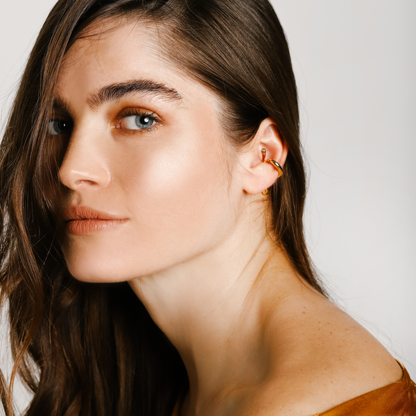 Model is wearing the SICILY EAR CUFF which is an 18k gold plated brass ear cuff.