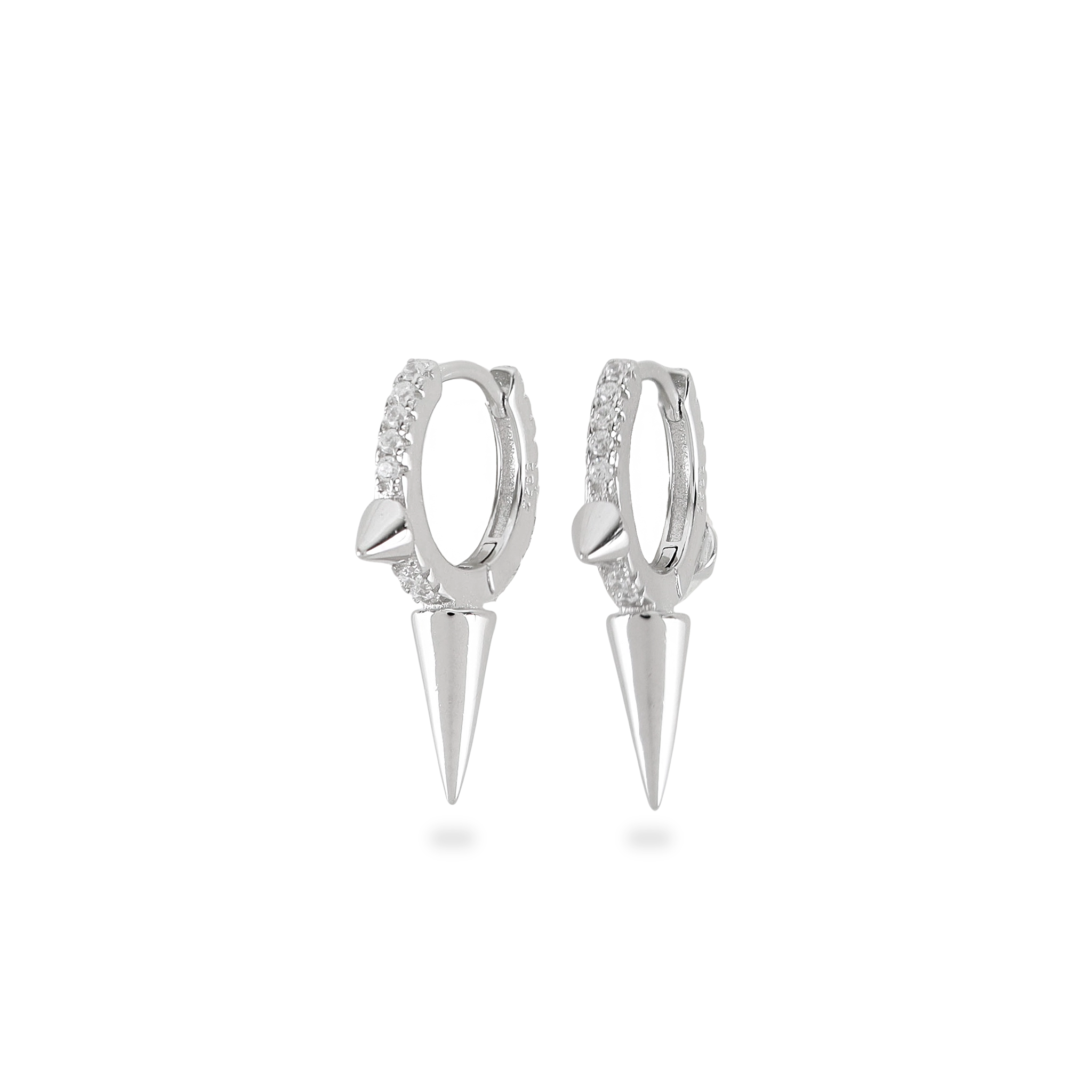 The One Shot Earring, a pair of silver hoop earrings featuring diamond-like accents and spike charms. ||| SILVER