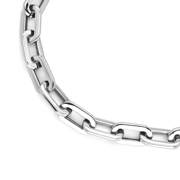Model wearing Link Bracelet and Link charm bracelet, Link Necklace and Link Charm Necklace. She is wearing multiple Artizan rings such as the Shape Stack Ring, Seeds ring and Rectangle ring.
