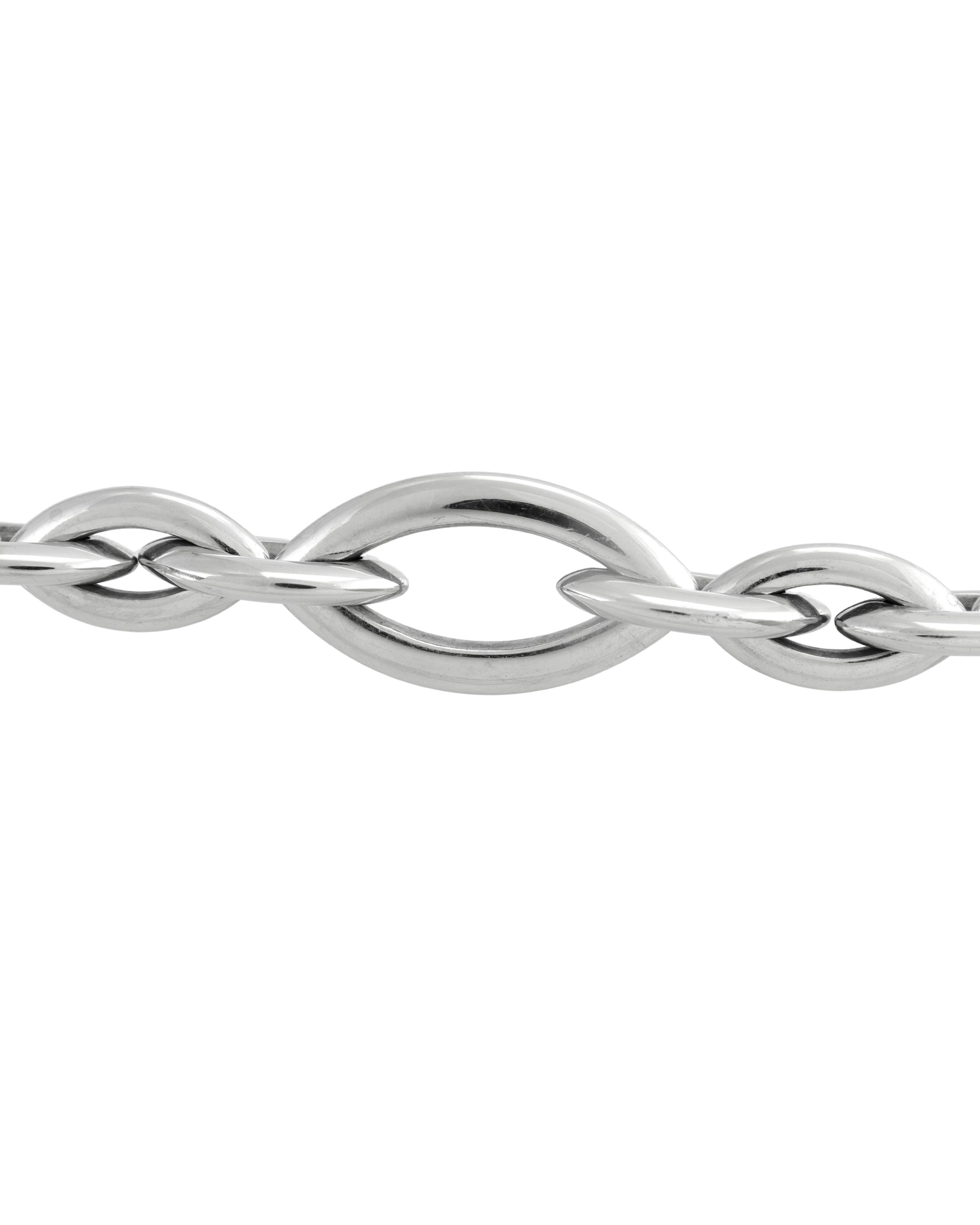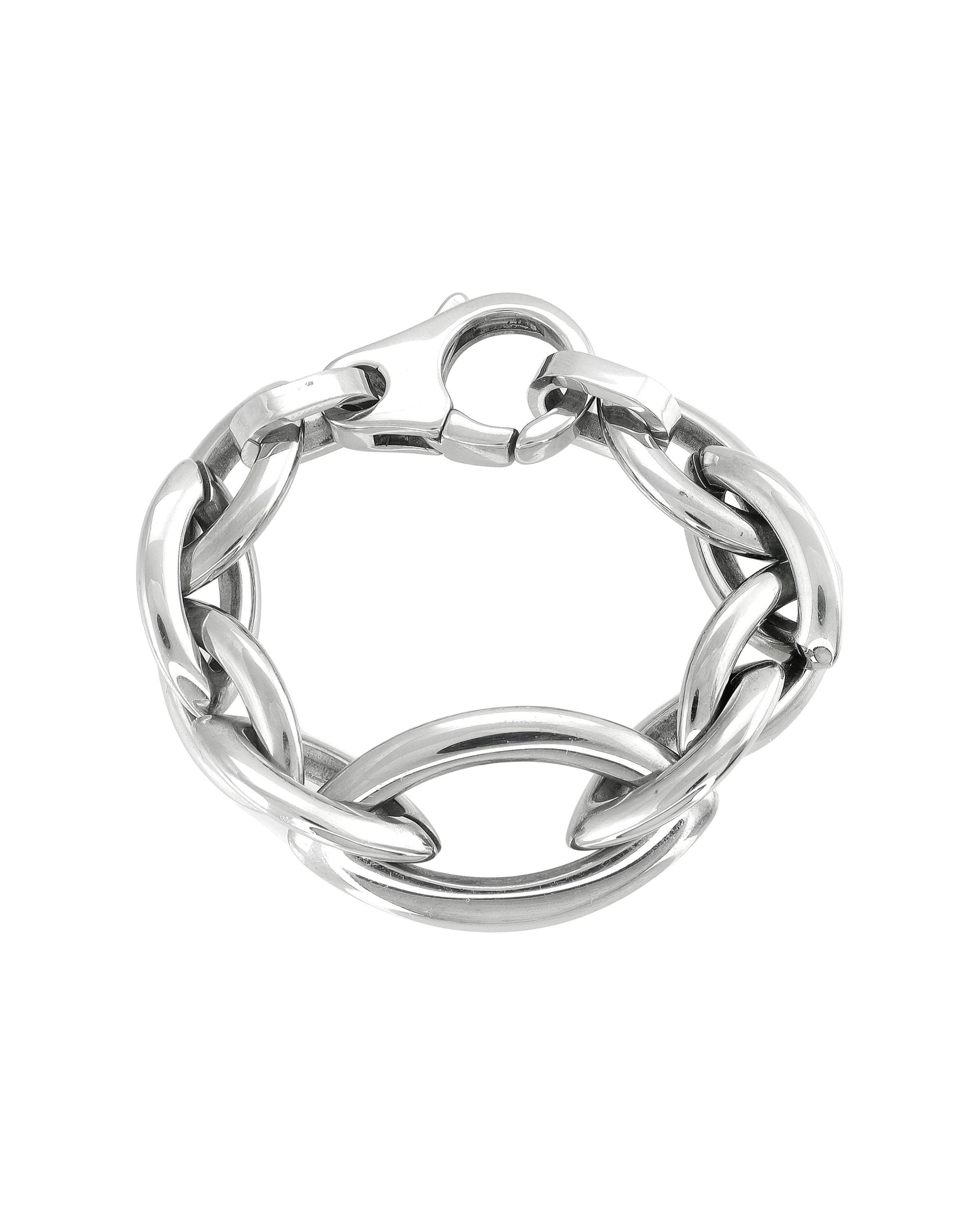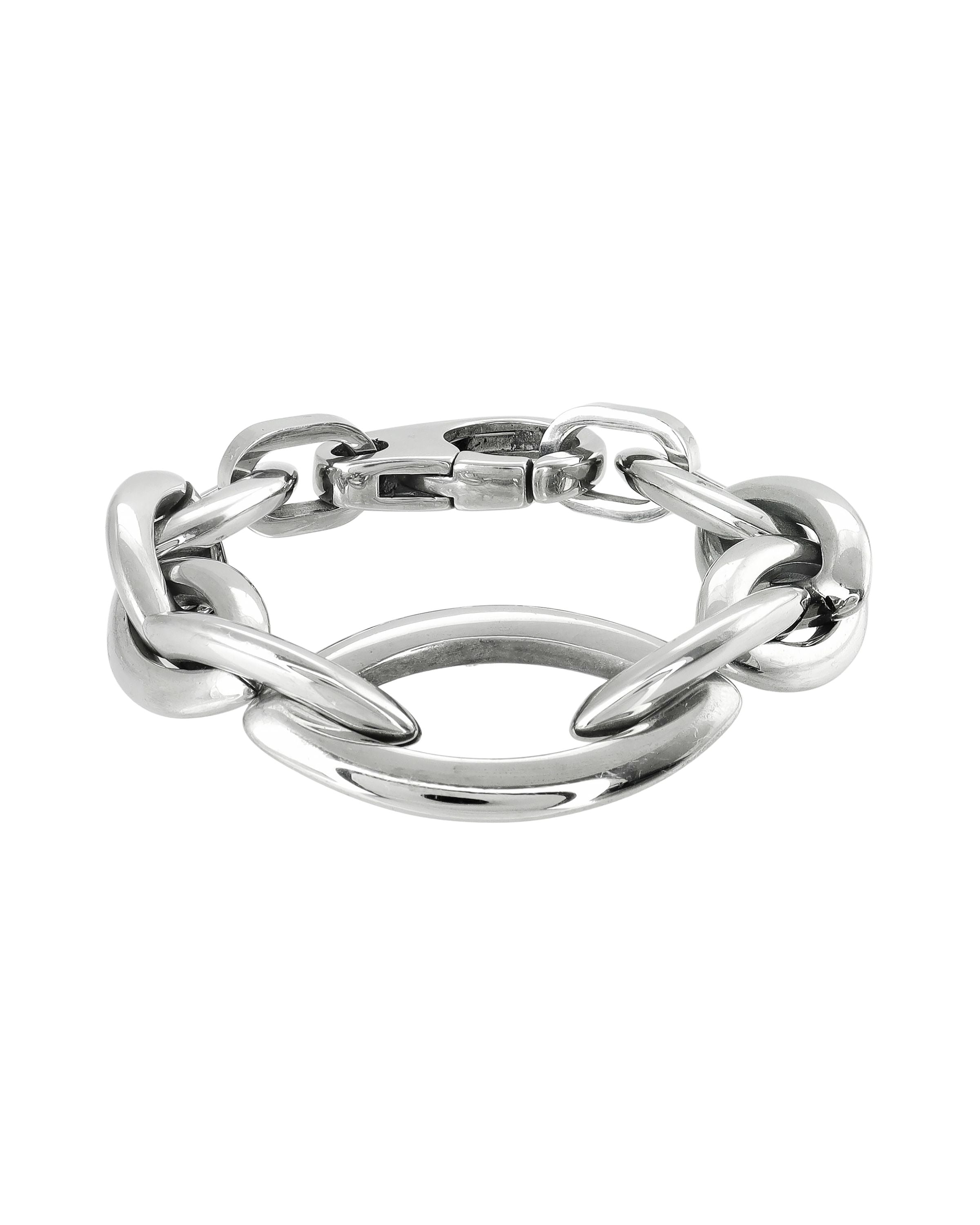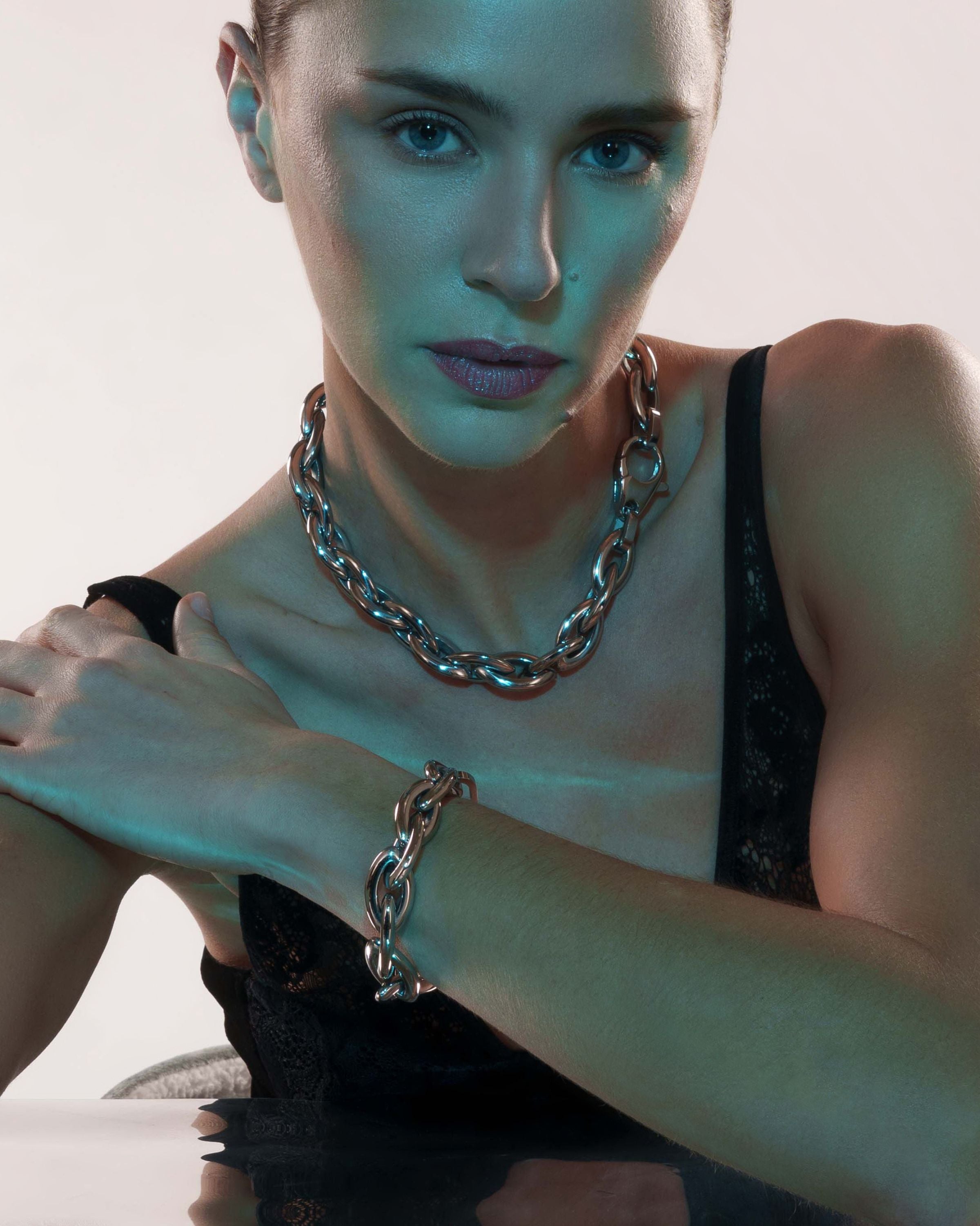 Model wearing a mixed metal bracelet stack with gold and silver bangles, a tennis bracelet, and a chunky chain bracelet on the wrist