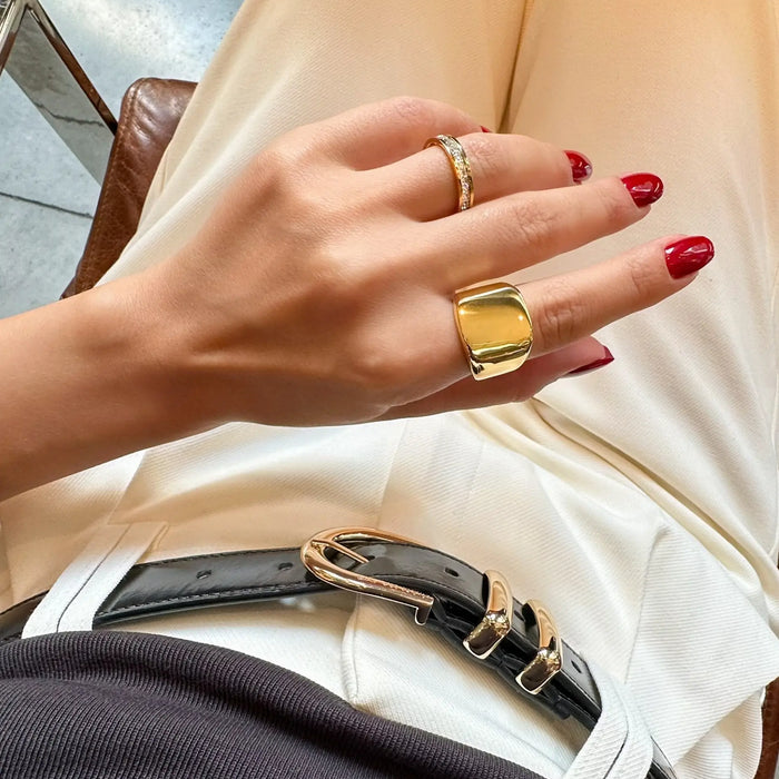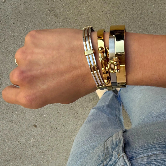 Model wearing the ISCHIA STACK which comes with a chain bracelet and a bangle. One is the Ischia bracelet which is a 7" Length Stainless steel chain with 18K gold plated lock and Zirconia charm and the Marinero bangle which is made of stainless steel with 18k gold plated details.