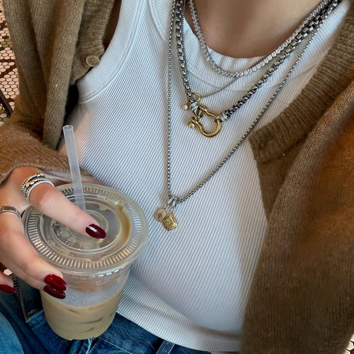 Model putting on the Herradura Mix Necklace, a silver necklace featuring a box chain with a gold horseshoe clasp. |||