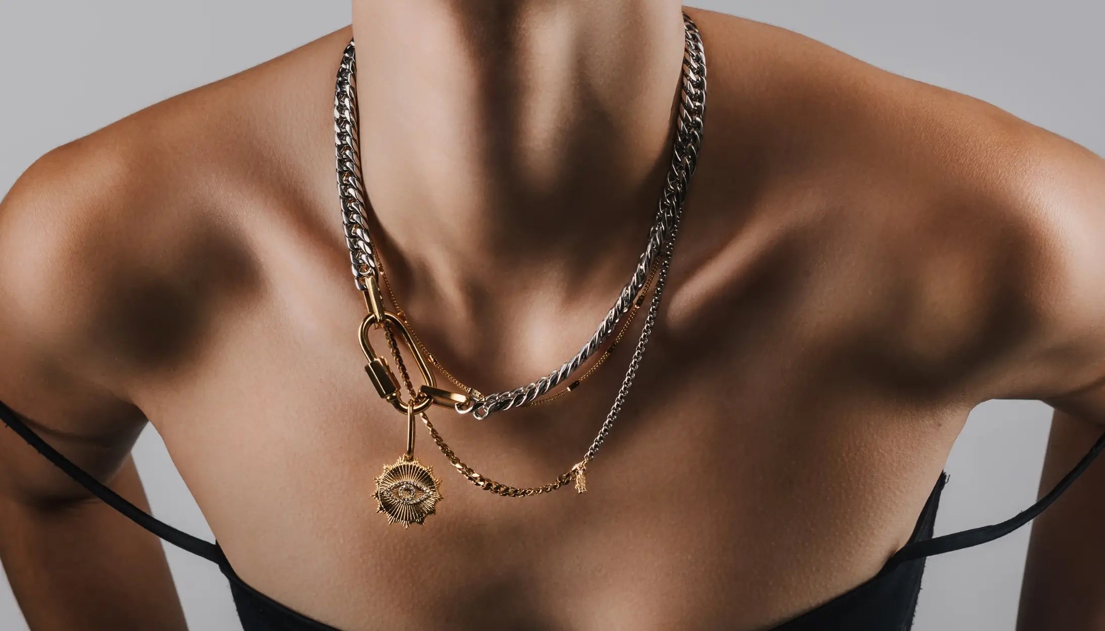 Model wearing the AMELIA LAYERED NECKLACE SET MIX, featuring layered gold and silver chains with a bold evil eye pendant.