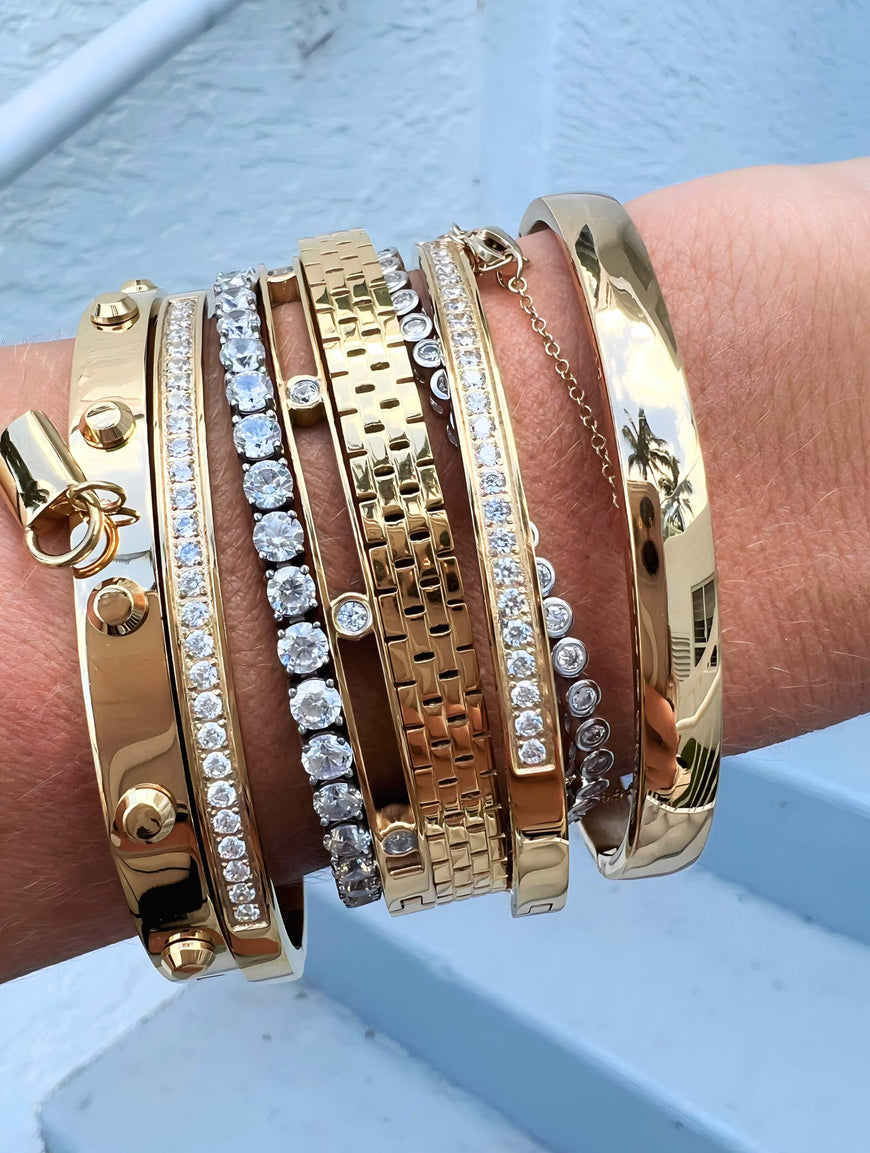 The ROUND CUT RIVIERE TENNIS BRACELET, which is a single gold bracelet with round-cut white stones in a bold prong setting. Not worn by a model.