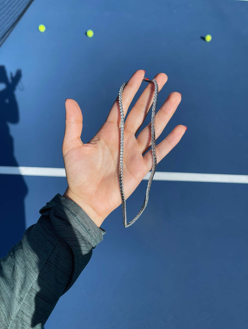 The Tennis Necklace, a silver necklace featuring a continuous line of sparkling diamond-like stones.
