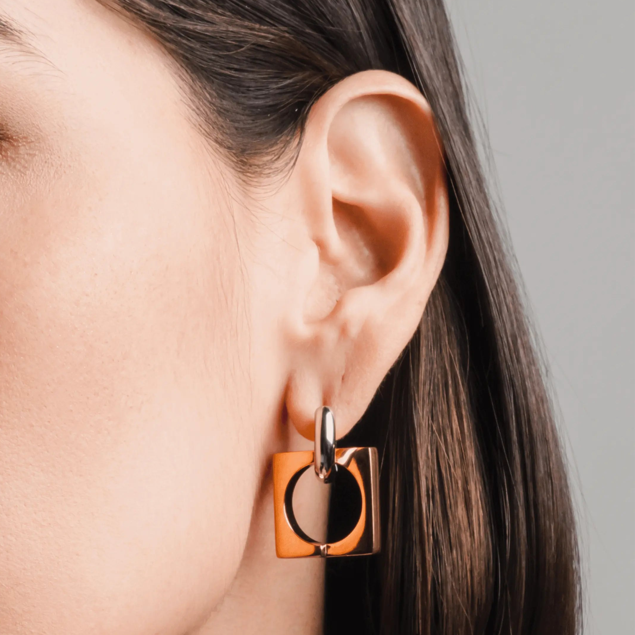Gold and silver **Square Mix Hoops Earrings**, featuring a modern geometric design with a bold square and circular charm combination.