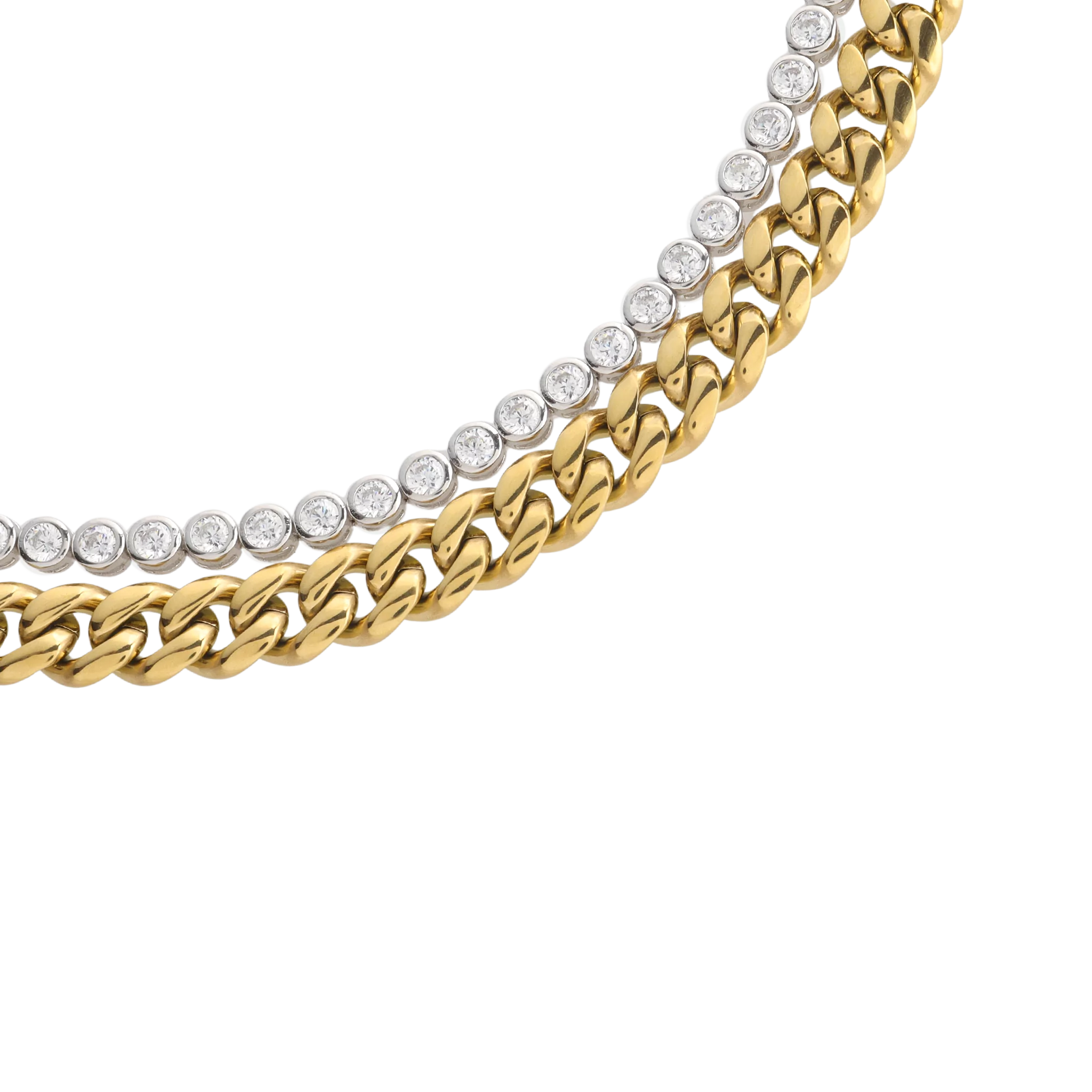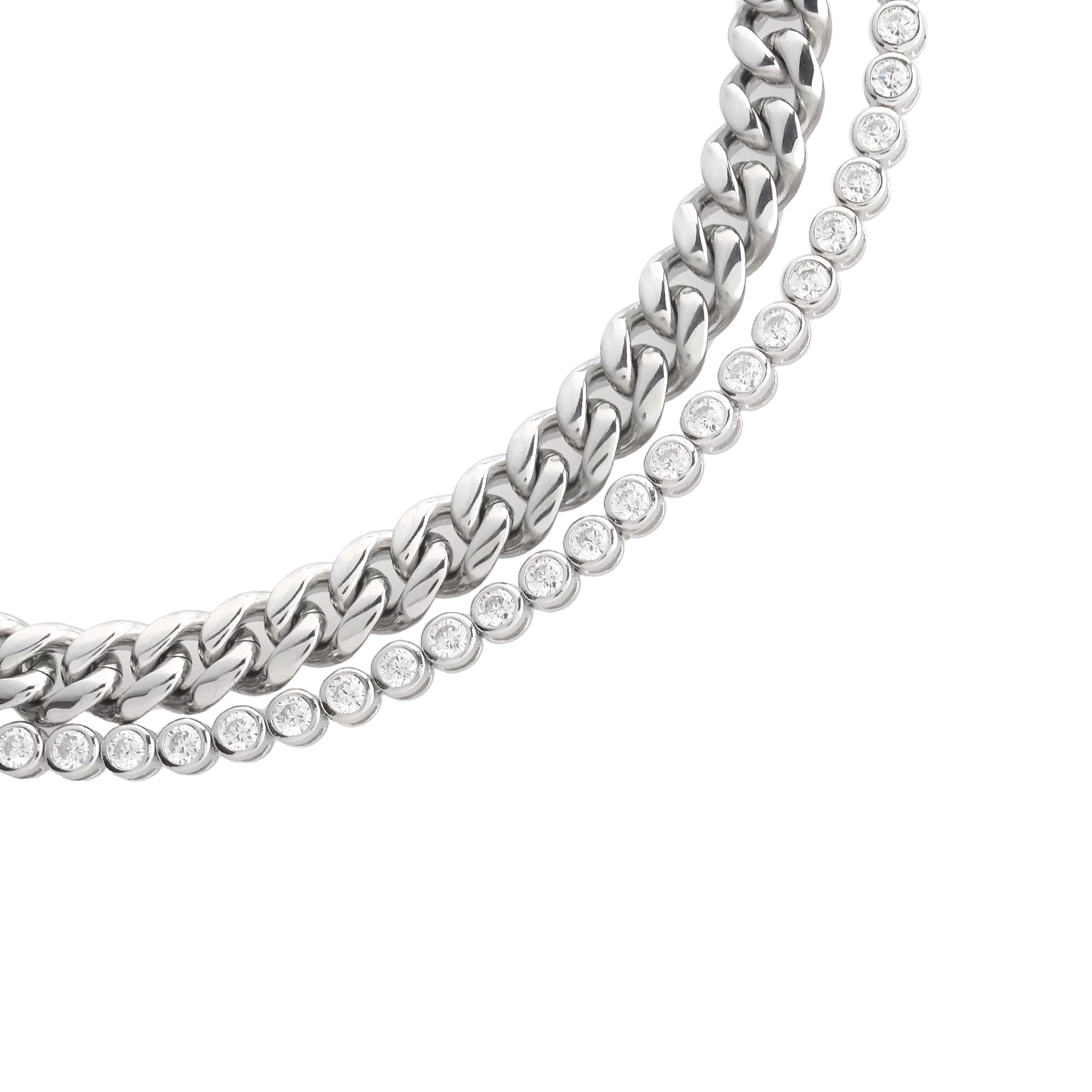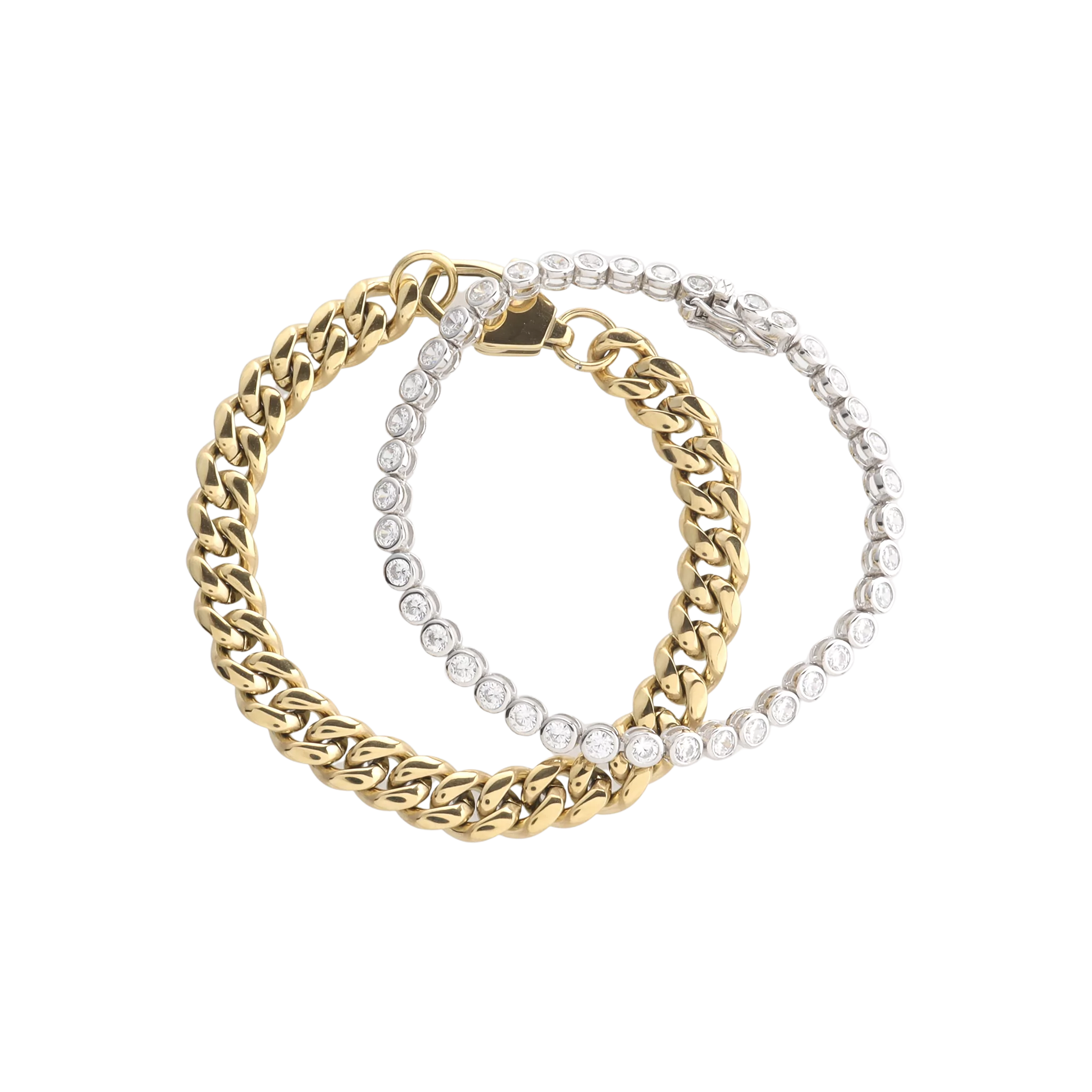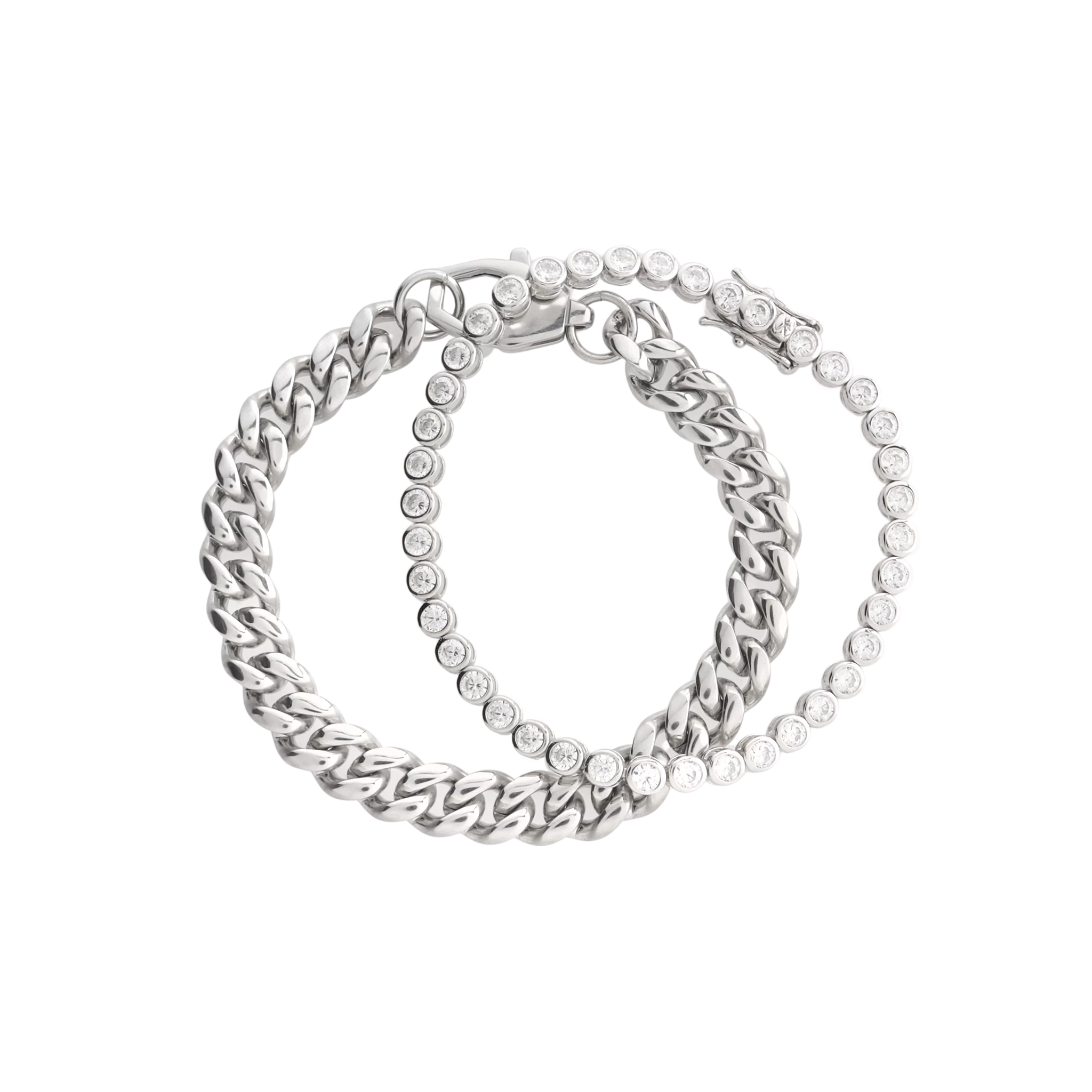 Bold, chic, and timeless---this bracelet set has it all. We paired our best-selling Bubble Tennis Bracelet with a bold chain to create one of the trendiest stacks in our collection. Accessorize a chic white-tee with this set and watch the look come to life.