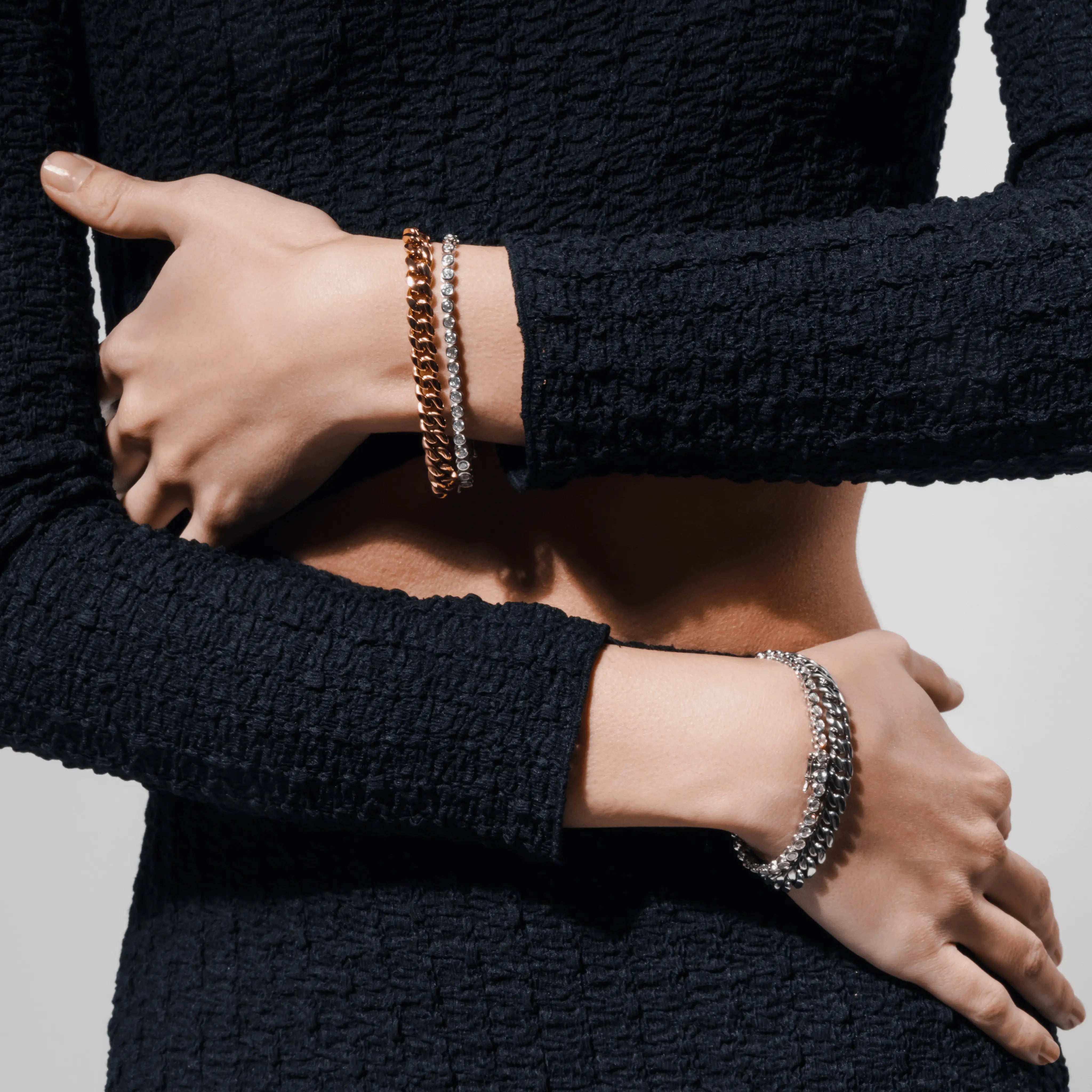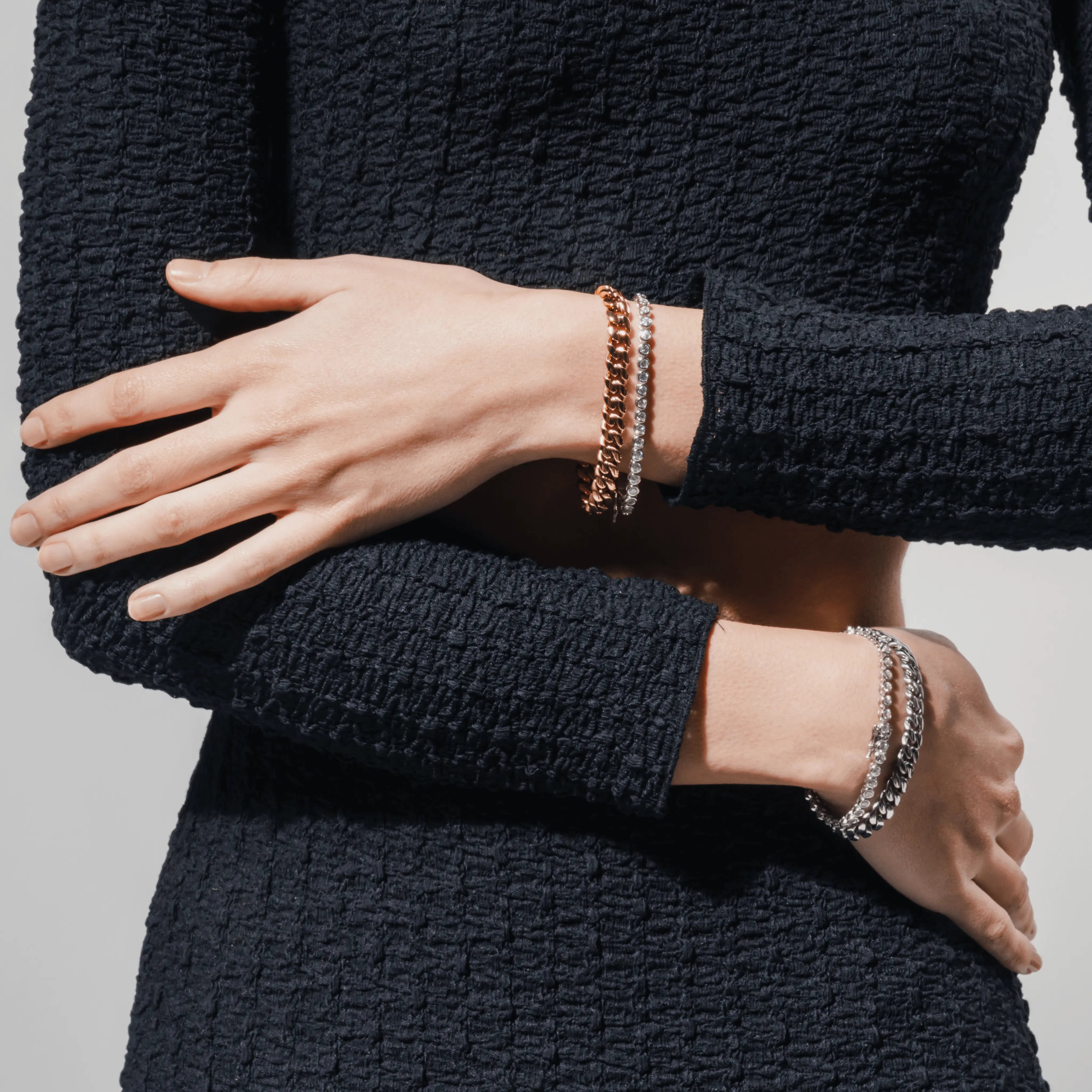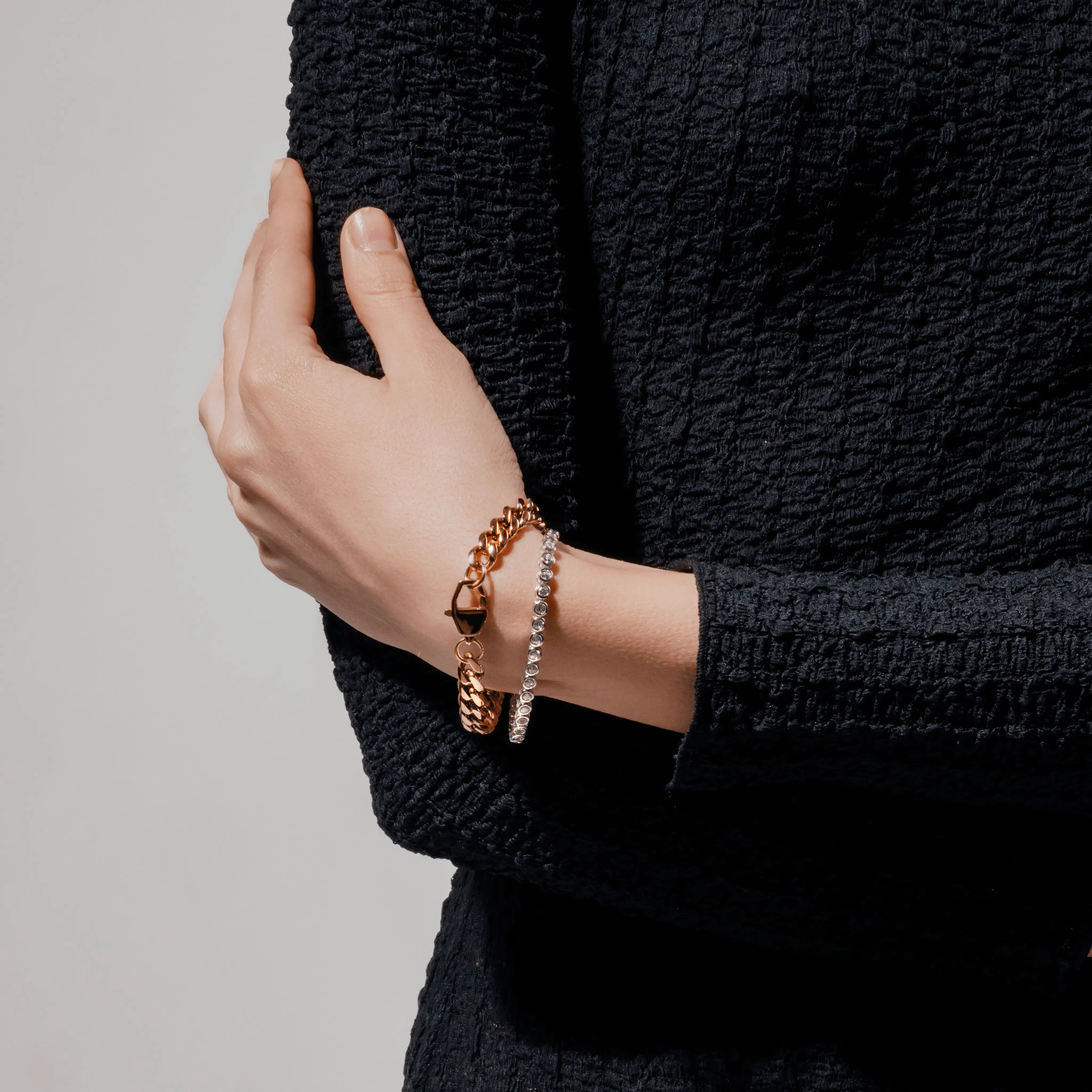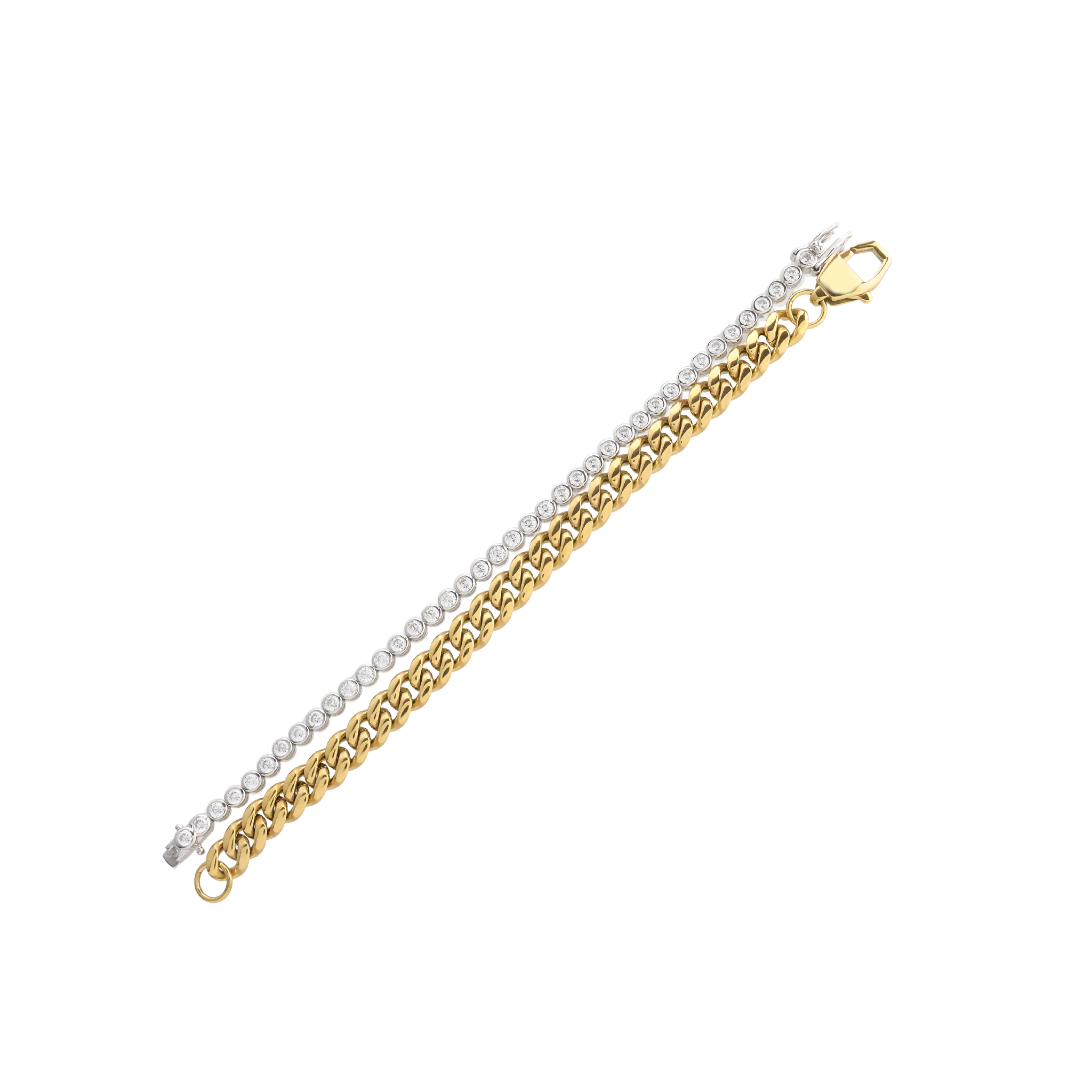 Bold, chic, and timeless---this bracelet set has it all. We paired our best-selling Bubble Tennis Bracelet with a bold chain to create one of the trendiest stacks in our collection. Accessorize a chic white-tee with this set and watch the look come to life.